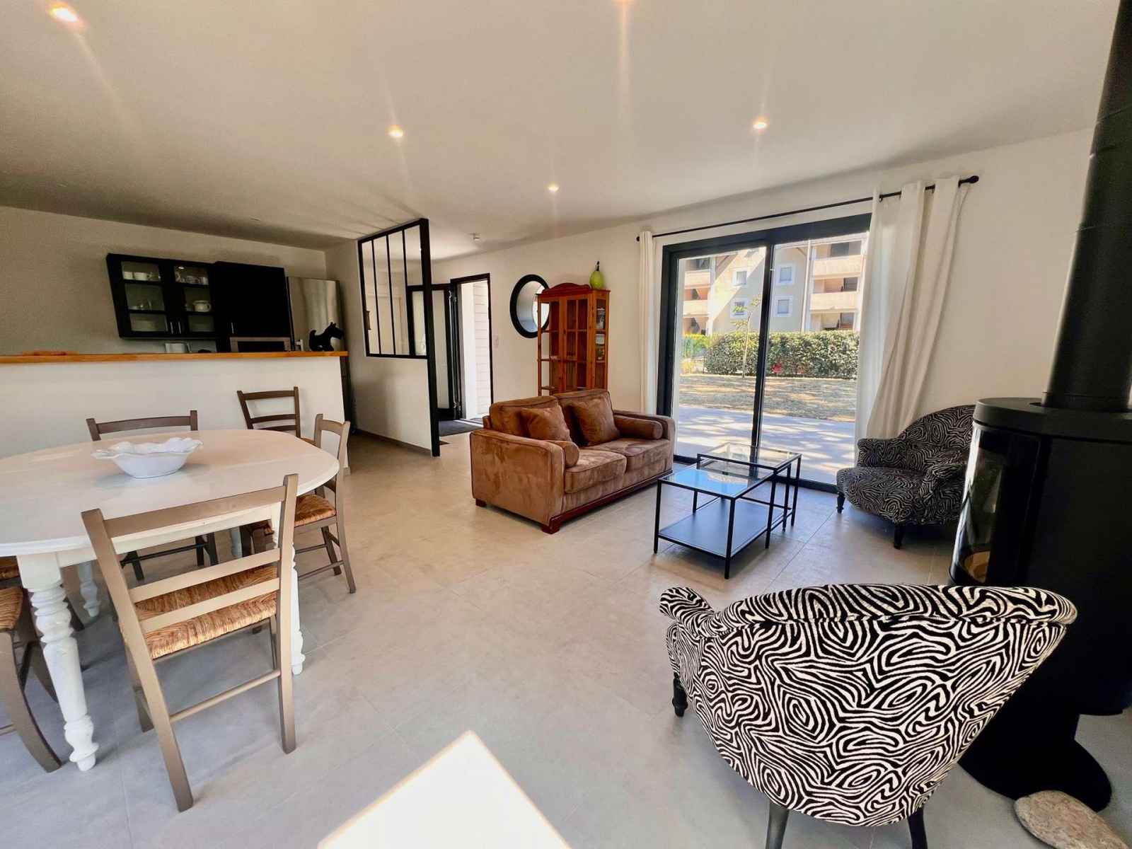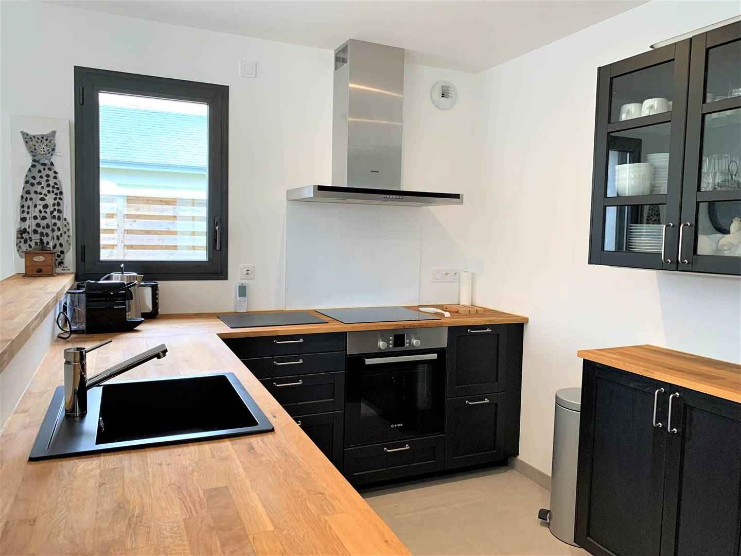 -une cuisine ouverte équipée (réfrigérateur/congélateur, plaque de cuisson induction, four, lave-vaisselle, micro-ondes),