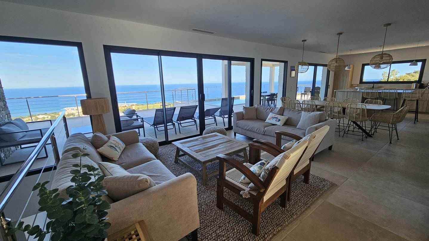 Le salon donne sur une belle terrasse semi couverte vue mer panoramique mer : transats, Salon de jardin, BBQ + plancha (au gaz), douche extérieure.