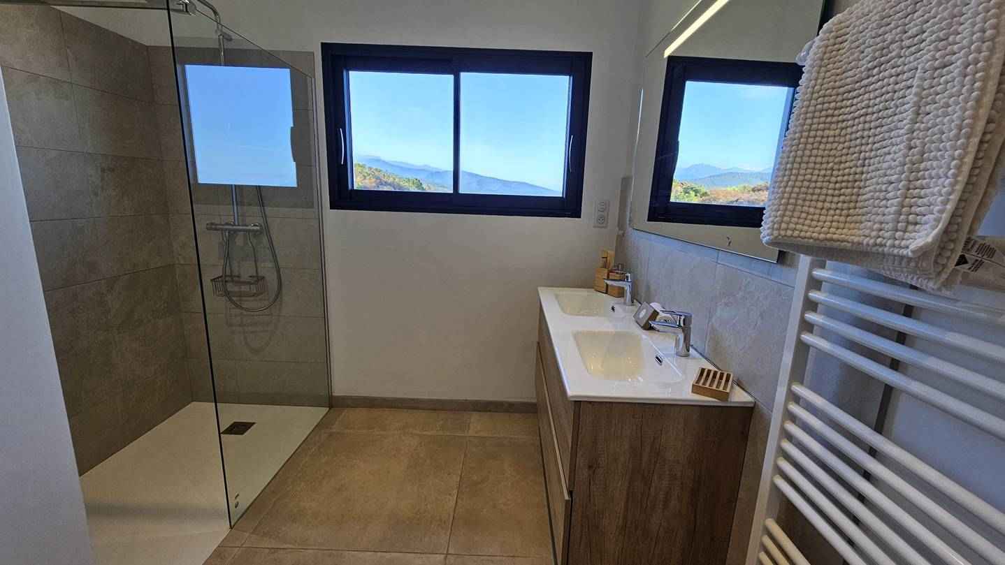 belle terrasse semi couverte vue mer panoramique mer : transats, salon de jardin, bbq, douche extérieure.