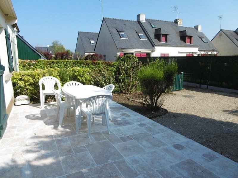 - Un jardin clos avec une terrasse équipée d'un salon de jardin, d'un parasol, de transats et d'un barbecue.