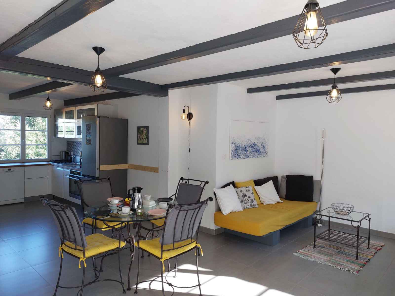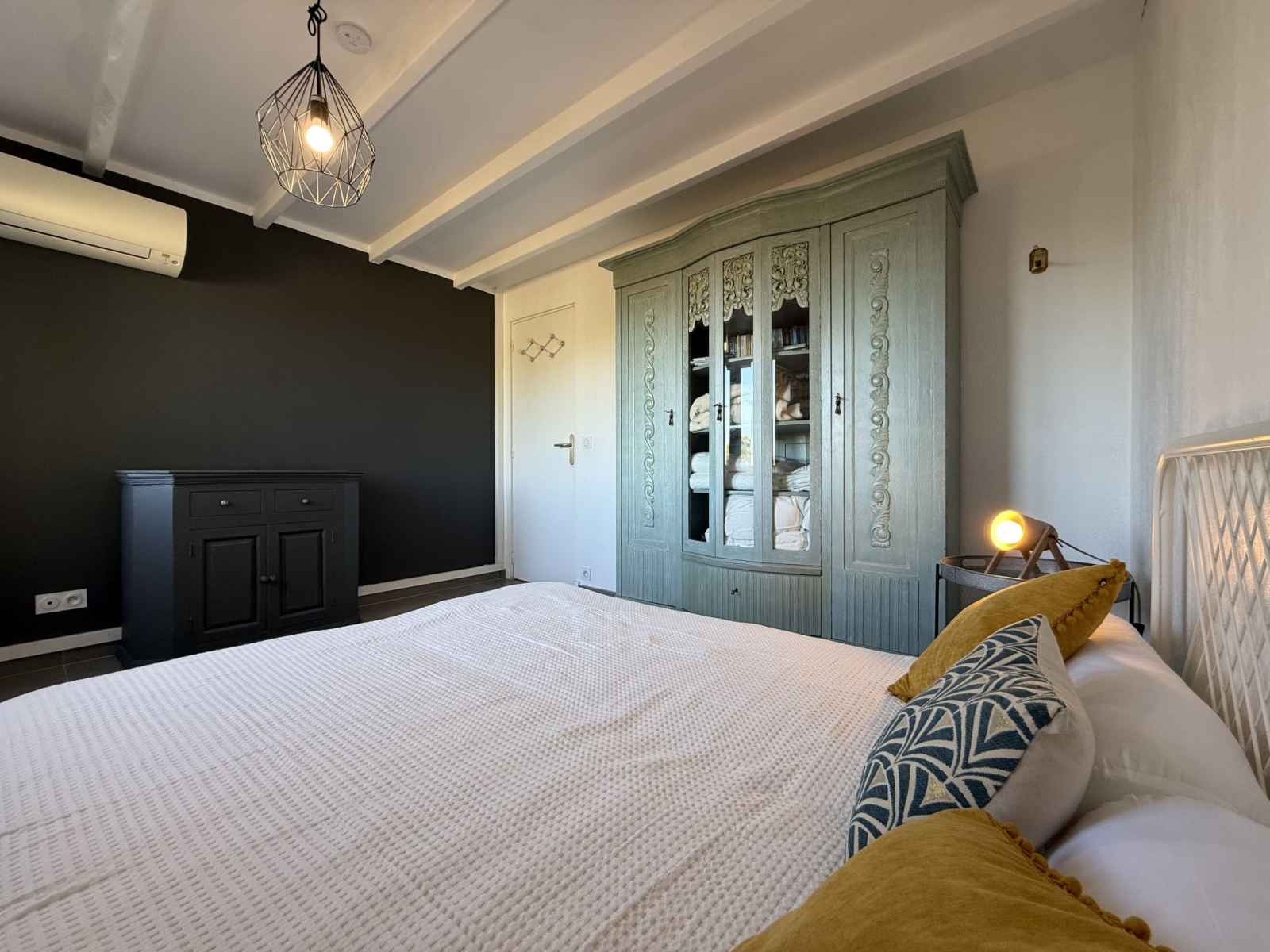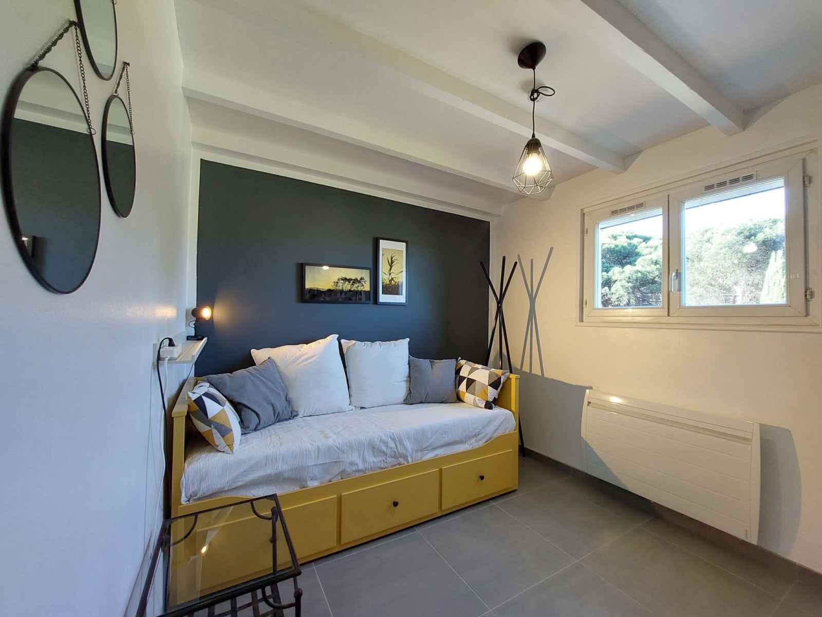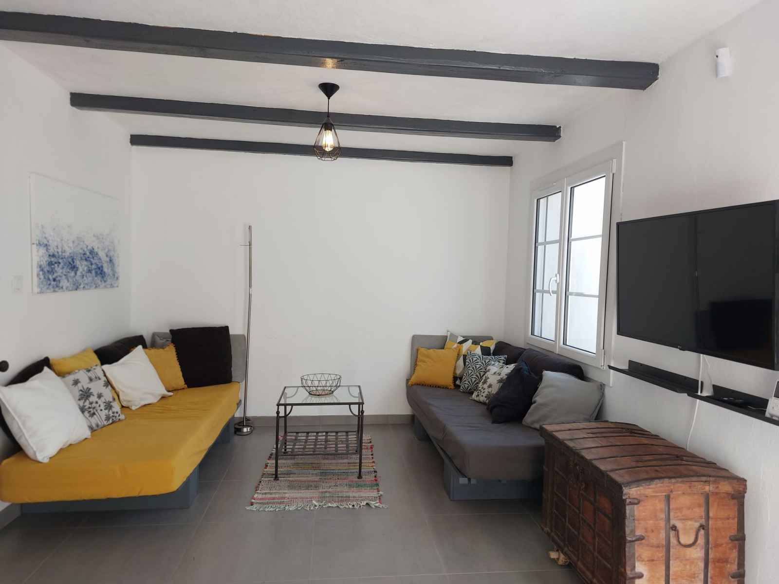 Maison 3 pièces 60 m2. séjour/salle à manger avec cheminée (uniquement à titre de décoration), tv, écran plat et air-conditionné. sortie sur la terrasse. 1 chambre avec 1 grand-lit (1 x 140 cm, longueur 190 cm), air-conditionné. 1 chambre d'enfants avec 1 lit gigogne (2 pers. 2 x 80 cm, longueur 190 cm). cuisine ouverte (mini-four,
