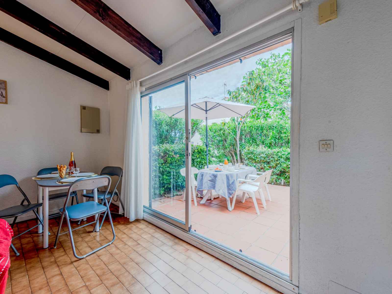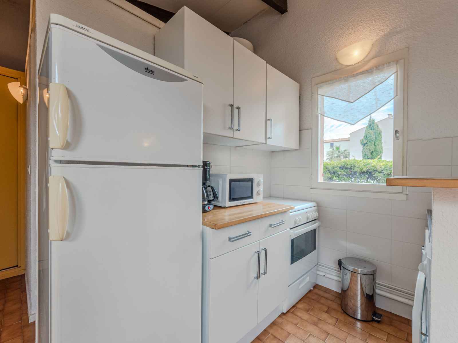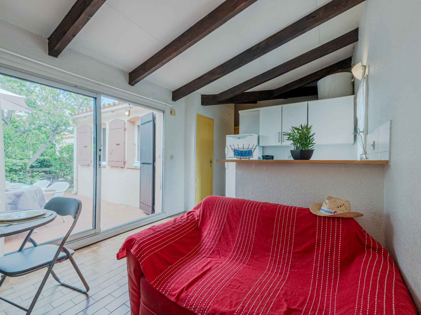 Maison mitoyenne 2 pièces 37 m2. séjour/salle à manger avec tv (écran plat). sortie sur la terrasse. 1 chambre avec 1 grand-lit (140 cm, longueur 190 cm). cabine avec 1 x 2 lits superposés (90 cm, longueur 180 cm). coin cuisine (3 plaques de cuisson, four, grille-pain, bouilloire électrique, micro-ondes, congélateur). salle de bains, wc