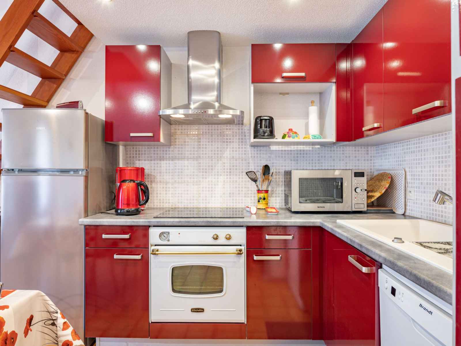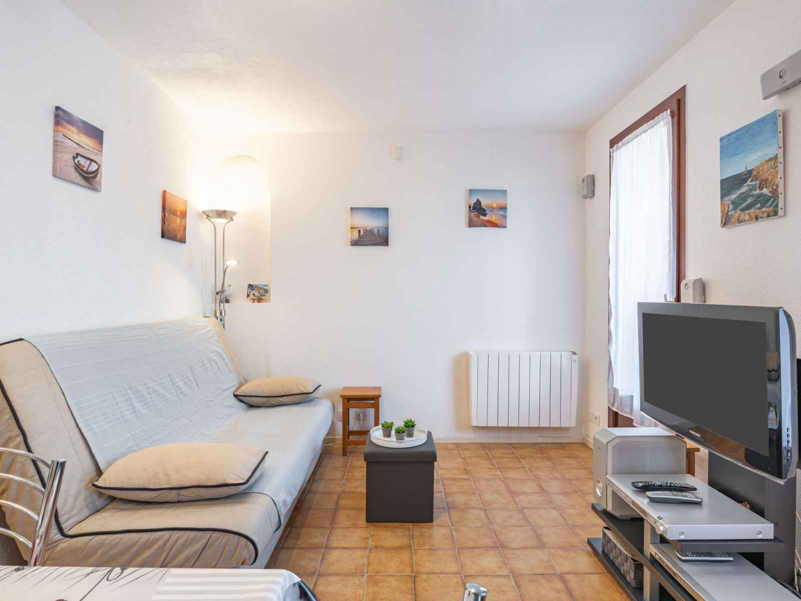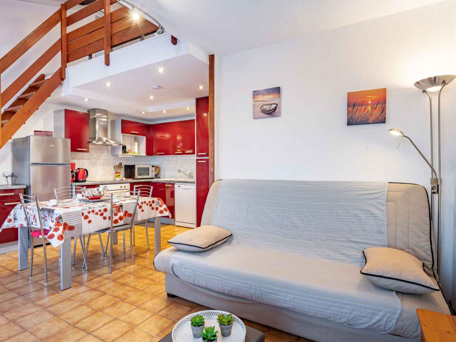 Maison mitoyenne studio 37 m2 sur 2 niveaux. séjour/salle à manger avec 1 divan-lit double (1 x 130 cm, longueur 190 cm), tv (écran plat), dvd et home cinéma. sortie sur la terrasse. coin cuisine (four, lave-vaisselle, 3 plaques à induction, congélateur, cafetière électrique, combiné micro-ondes). douche/wc. À l'étage supérieur: