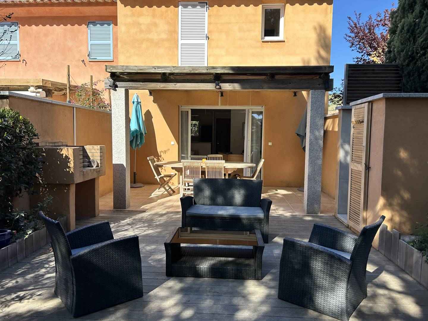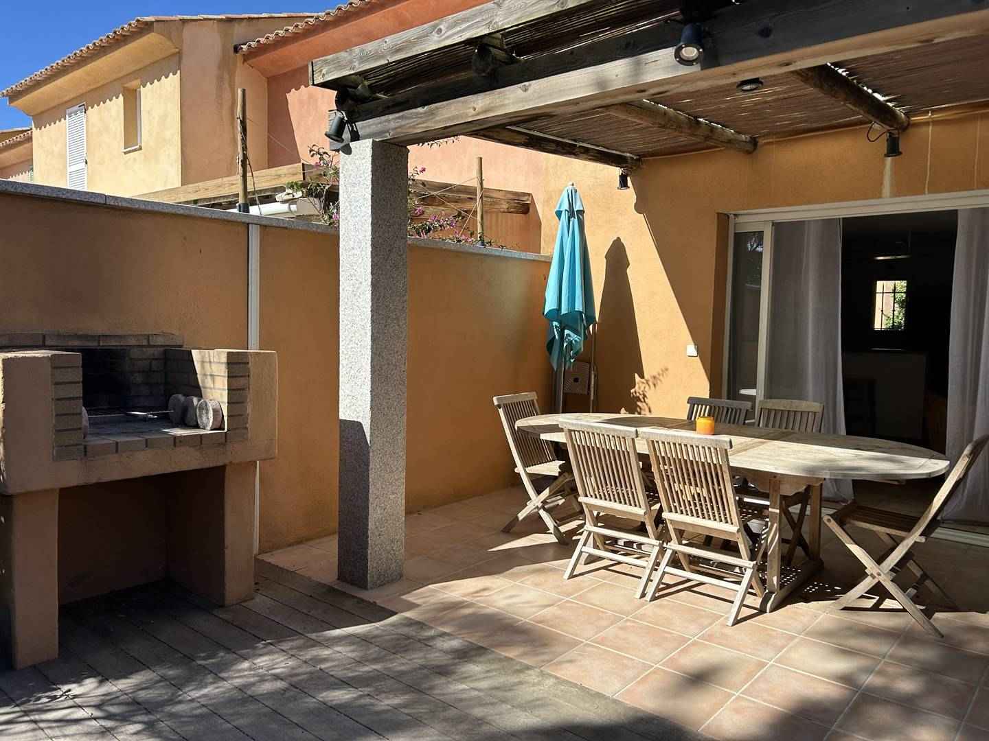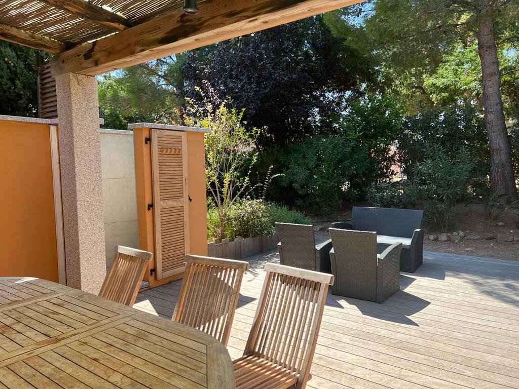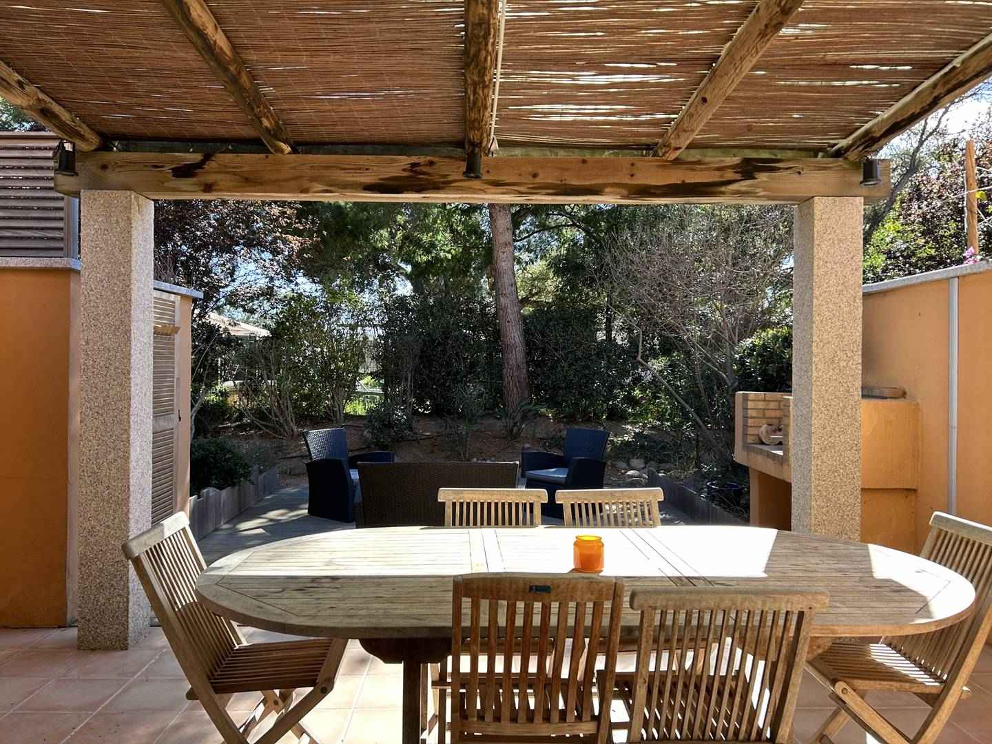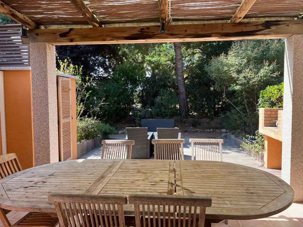 Terrasse (couverte) avec petit jardin privatif : salon de jardin, douche extérieure (chaud/froid), barbecue fixe en pierre, ombragée par 1 pin. Exposition sud