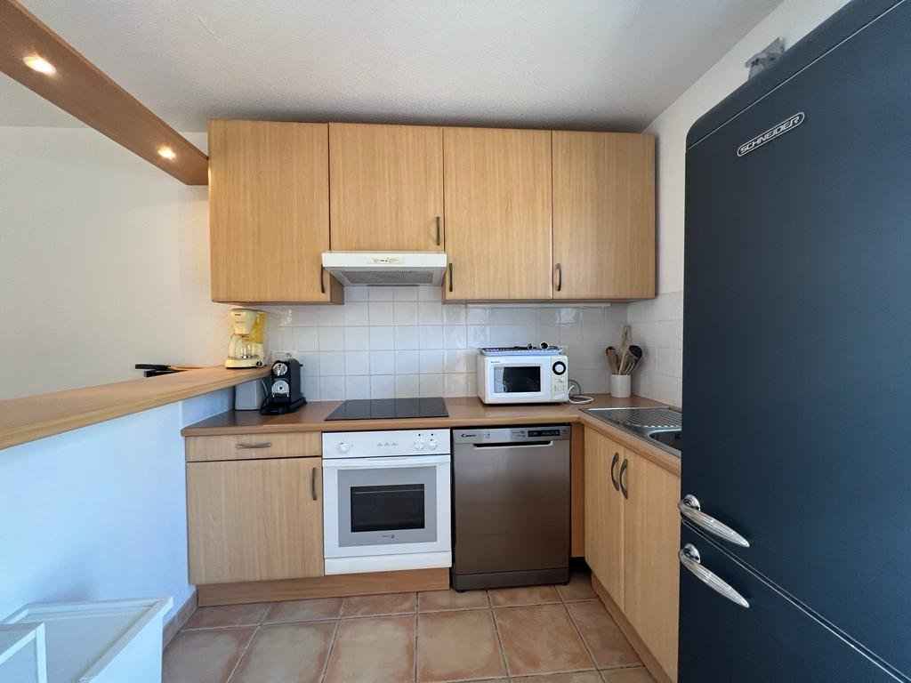 Séjour/cuisine américaine - (baie vitrée) – ventilateur - internet par WI-FI: plaque de cuisson (vitrocéramique), four (électrique), hotte aspirante, frigo-congélateur, cafetière NESPRESSO, lave-vaisselle, rangements aménagés, canapé convertible, télévision.