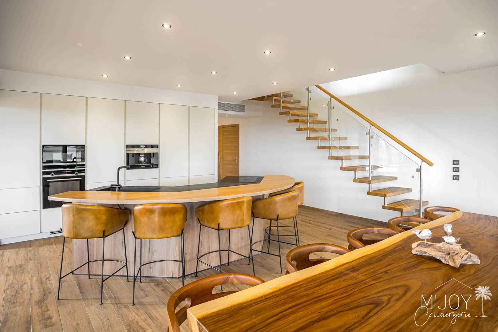 Son îlot central avec bar intégré en bois brut invite à la convivialité, que ce soit pour préparer un repas gastronomique ou partager un apéritif en toute simplicité.