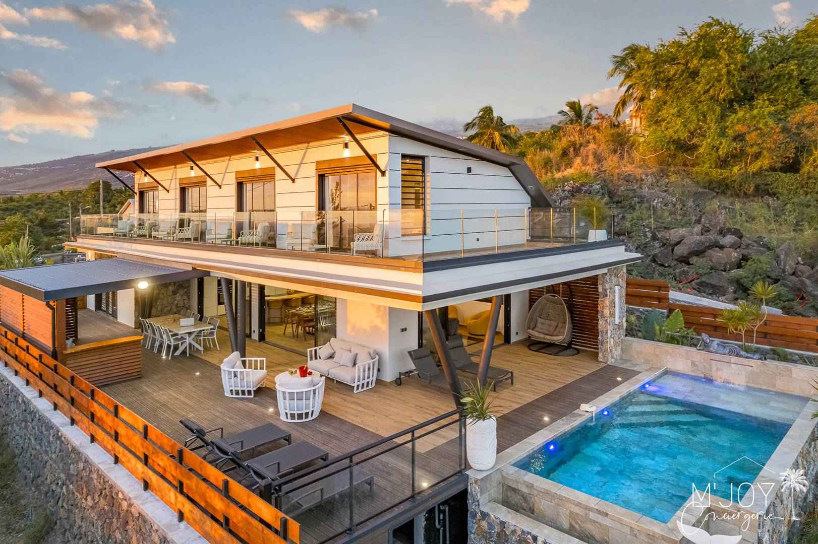 Enfin, la piscine en pierres et son doux son de cascade invitent à l’évasion. La partie à débordement donne l’illusion d’infini vers l’océan. Sécurisée par une alarme, elle est aussi chauffée pendant l’hiver austral de mai à octobre.