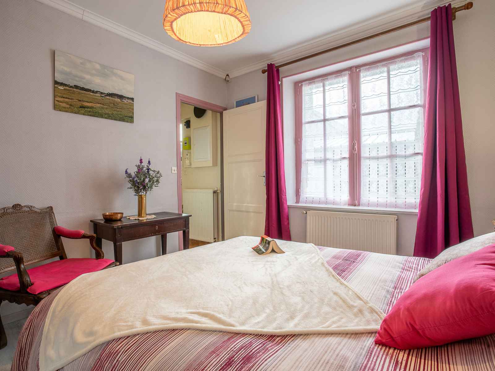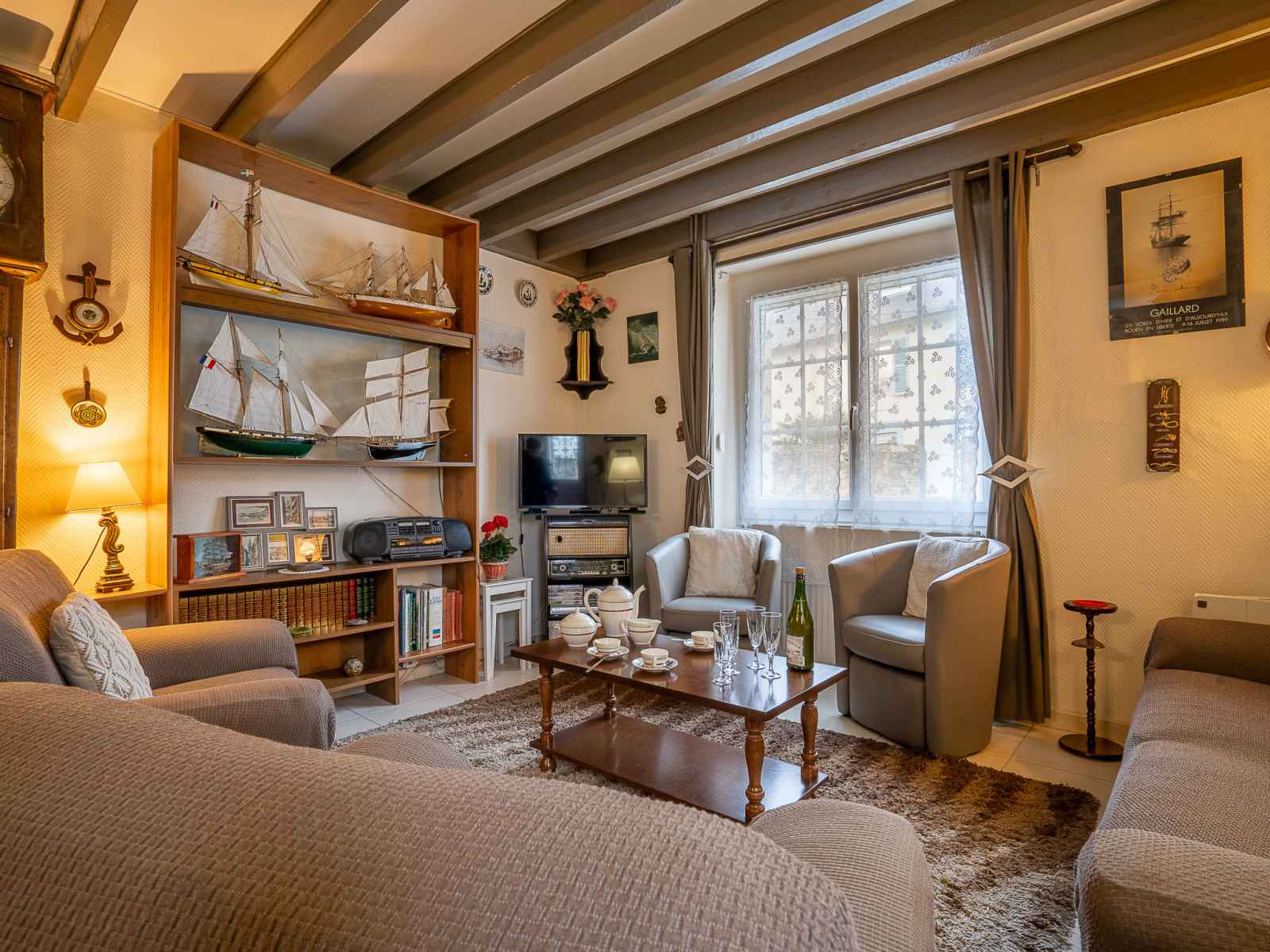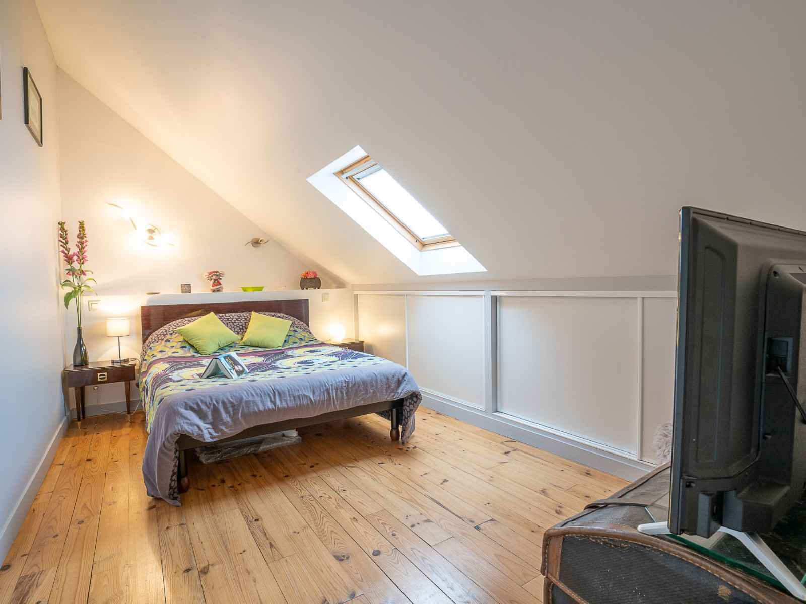 Maison 5 pièces 100 m2 sur 2 niveaux. partiellement rénovée, aménagement fonctionnel et rustique: séjour/salle à manger avec bibliotheque et tv. sortie sur le jardin. 2 chambres, chaque chambre avec: 1 grand-lit (1 x 140 cm, longueur 190 cm). grande cuisine (four, lave-vaisselle, 3 plaques vitrocéramiques, micro-ondes, cafetière