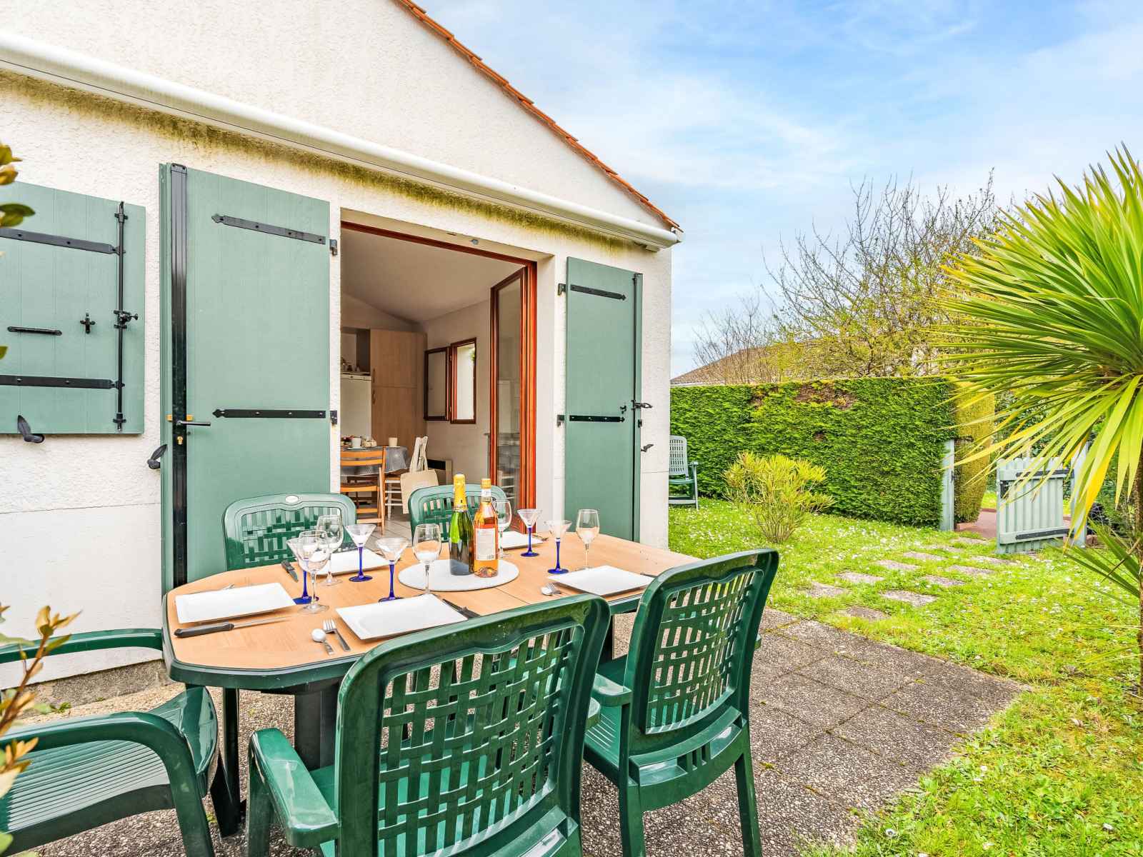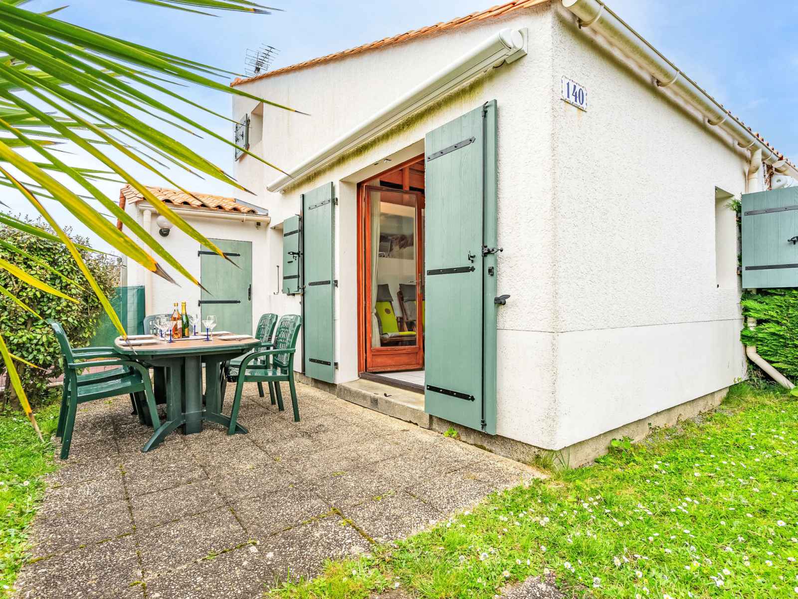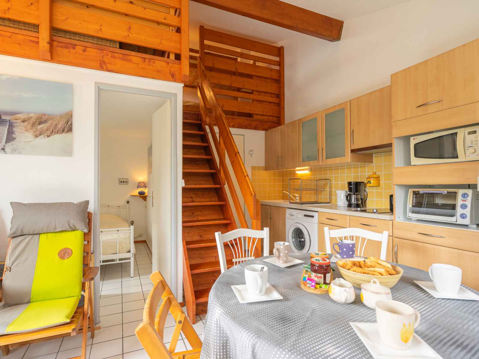 Maison mitoyenne 2 pièces 35 m2 sur 2 niveaux. séjour avec tv (écran plat). sortie sur la terrasse, sur le jardinet. 1 chambre avec 1 grand-lit (1 x 140 cm, longueur 190 cm). coin cuisine (mini-four, 2 plaques vitrocéramiques, grille-pain, bouilloire électrique, micro-ondes, congélateur, cafetière électrique). douche, wc séparé.