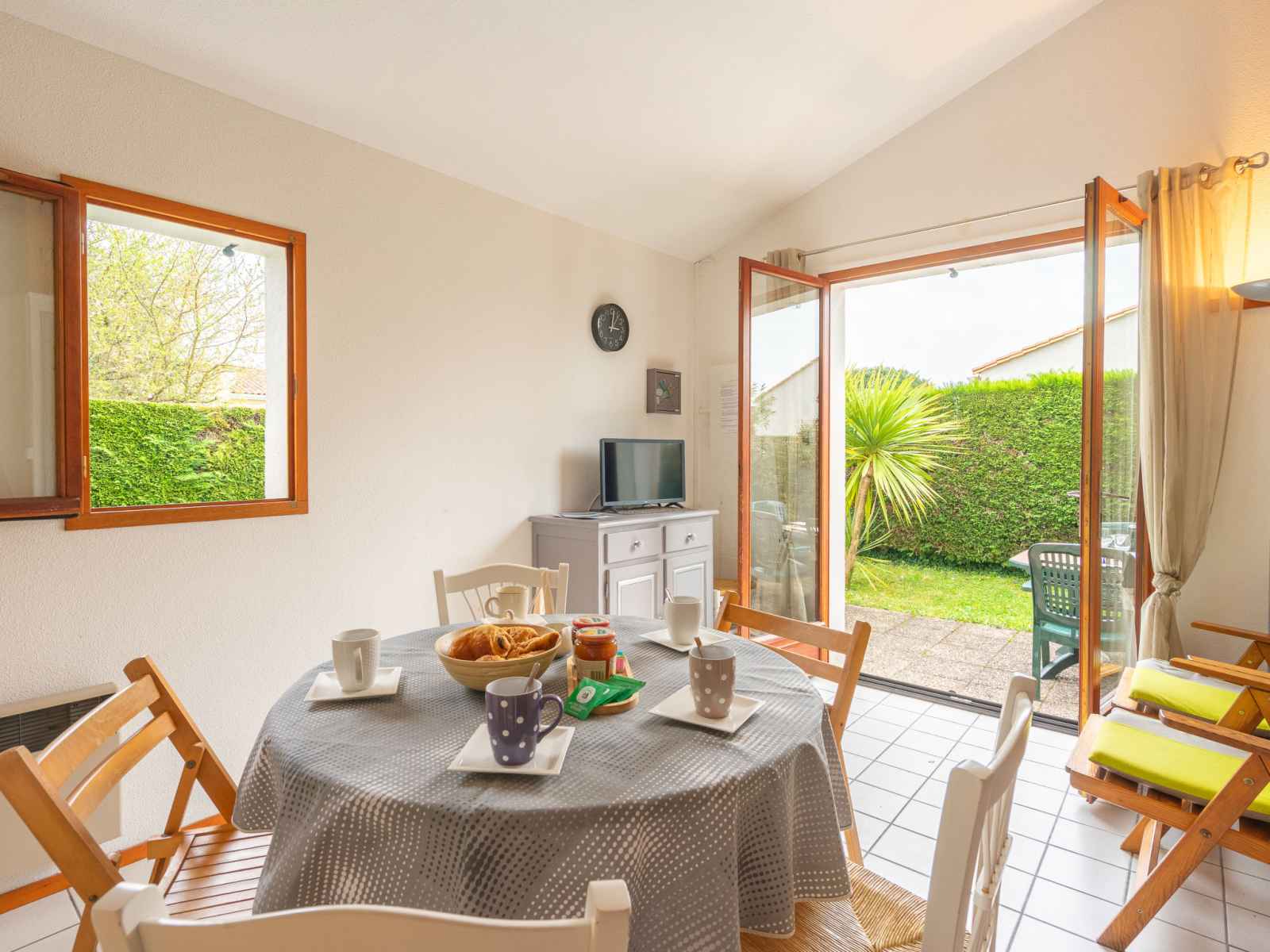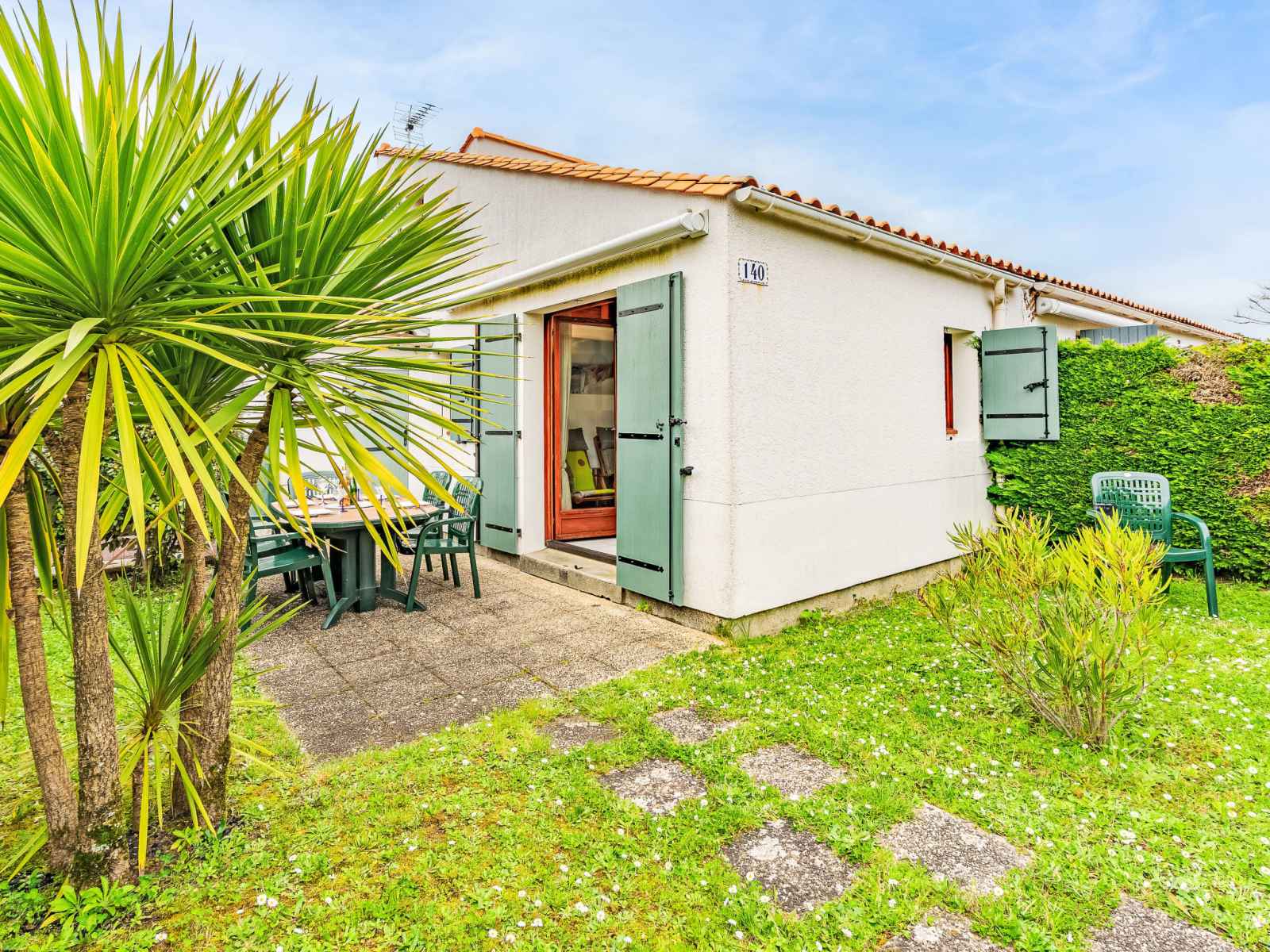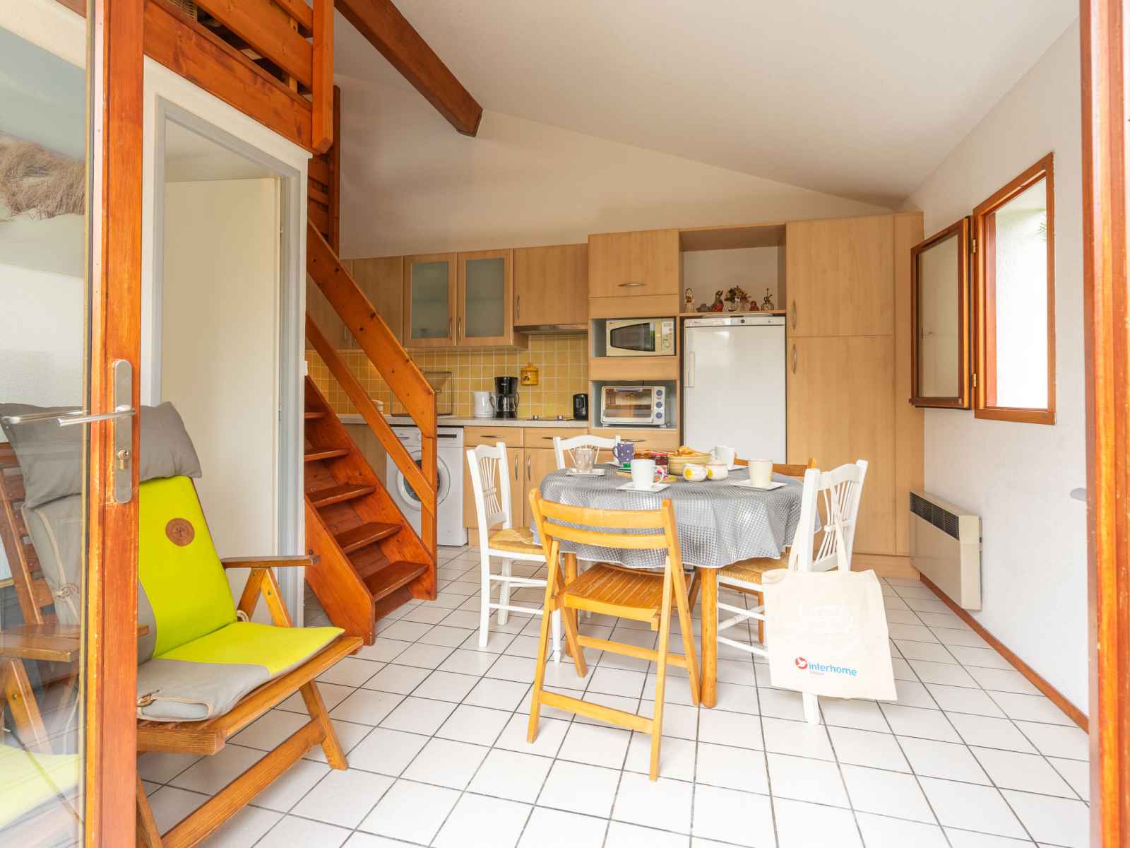 Maison mitoyenne 2 pièces 35 m2 sur 2 niveaux. séjour avec tv (écran plat). sortie sur la terrasse, sur le jardinet. 1 chambre avec 1 grand-lit (1 x 140 cm, longueur 190 cm). coin cuisine (mini-four, 2 plaques vitrocéramiques, grille-pain, bouilloire électrique, micro-ondes, congélateur, cafetière électrique). douche, wc séparé.