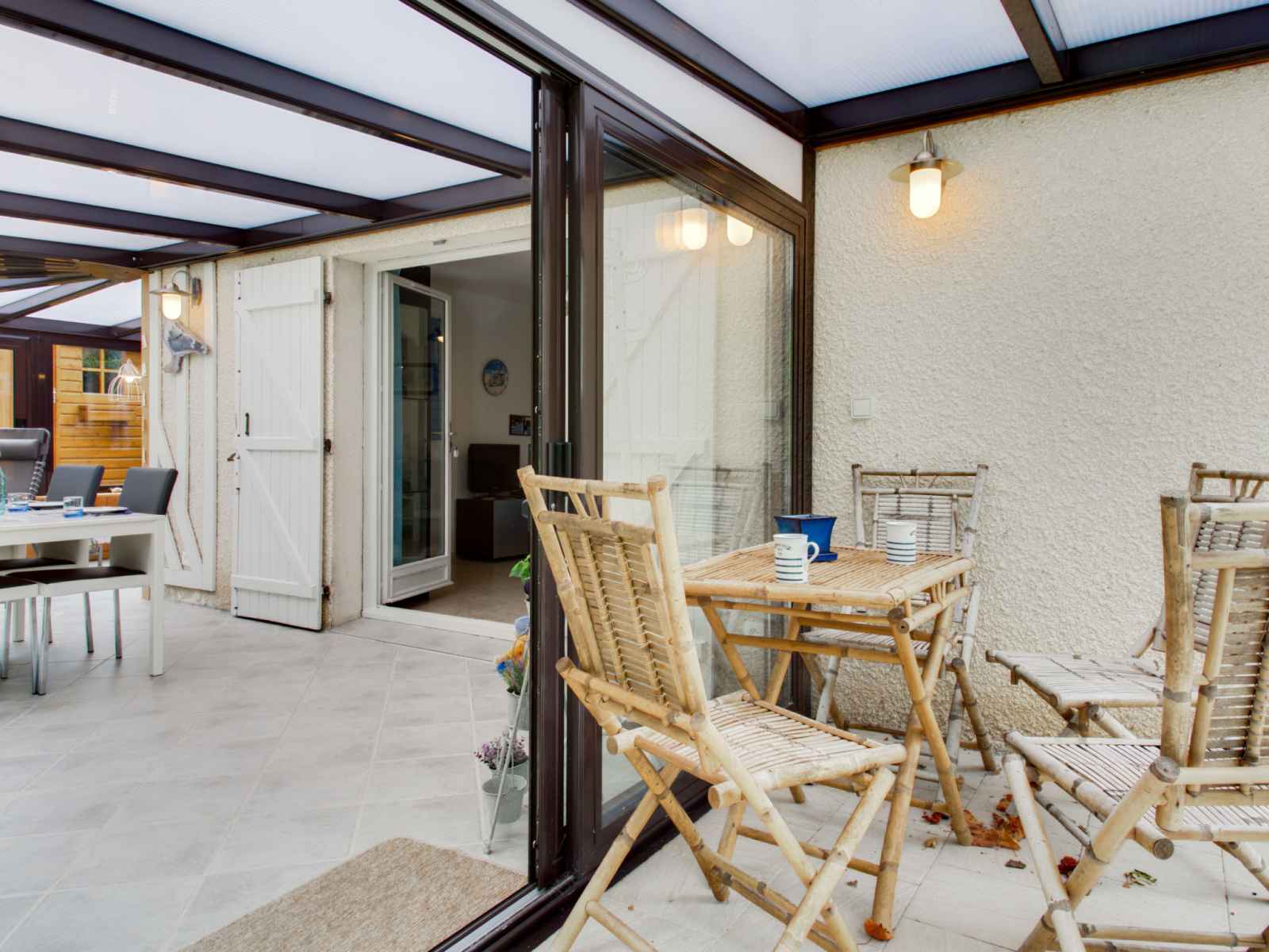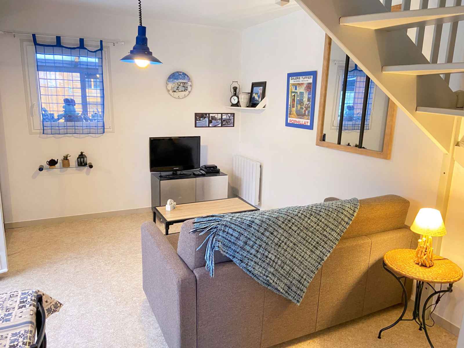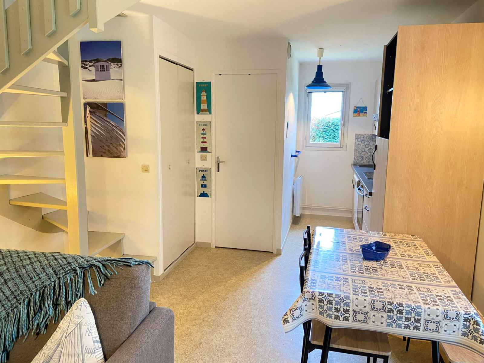 Maison mitoyenne 3 pièces 77 m2 sur 2 niveaux, situation nord-est. séjour/salle à manger avec dvd. sortie sur la véranda. cuisine ouverte (four, lave-vaisselle, 3 plaques vitrocéramiques, grille-pain, bouilloire électrique, micro-ondes, cafetière électrique). douche/wc. chauffage électrique. À l'étage supérieur: 1 chambre avec 1