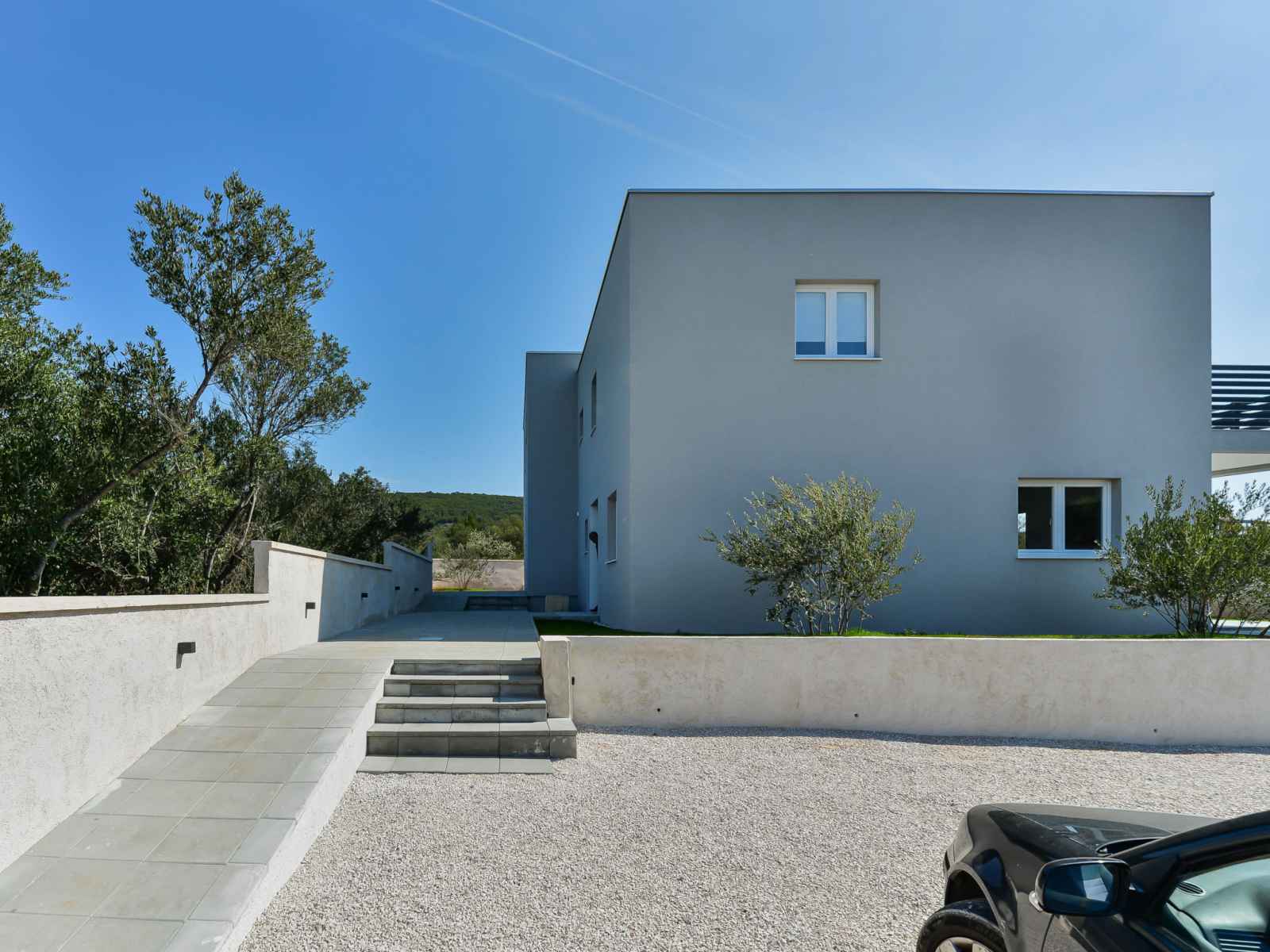 Tribunj à 5 km de vodice: belle maison jumelée moderne "gušt", de 2 étages, année de construction 2023. dans le hameau de sovlje, à 1.5 km du centre de tribunj, situation tranquille, ensoleillée, à 400 m de la mer, à 500 m de la plage. a usage privé: terrain 350 m2, piscine rectangulaire, chauffée (6 x 3 m, 21 m2, profondeur 150 cm,