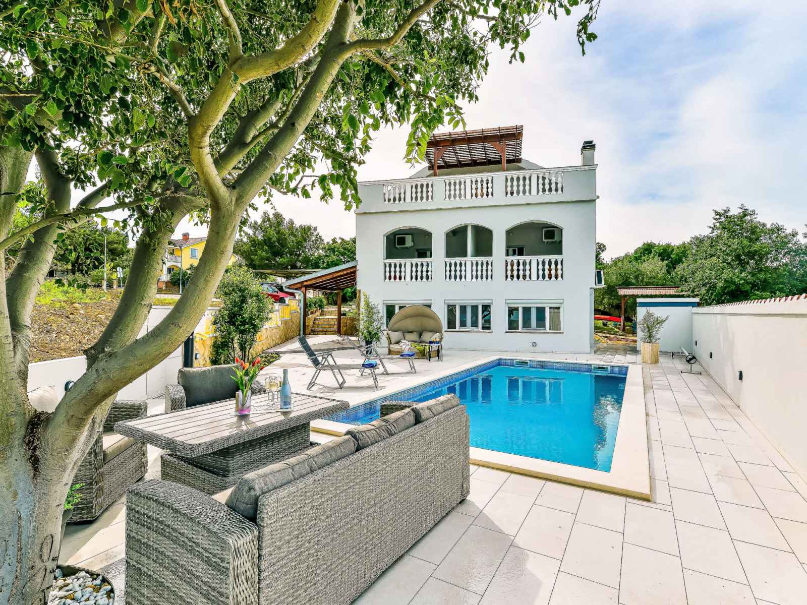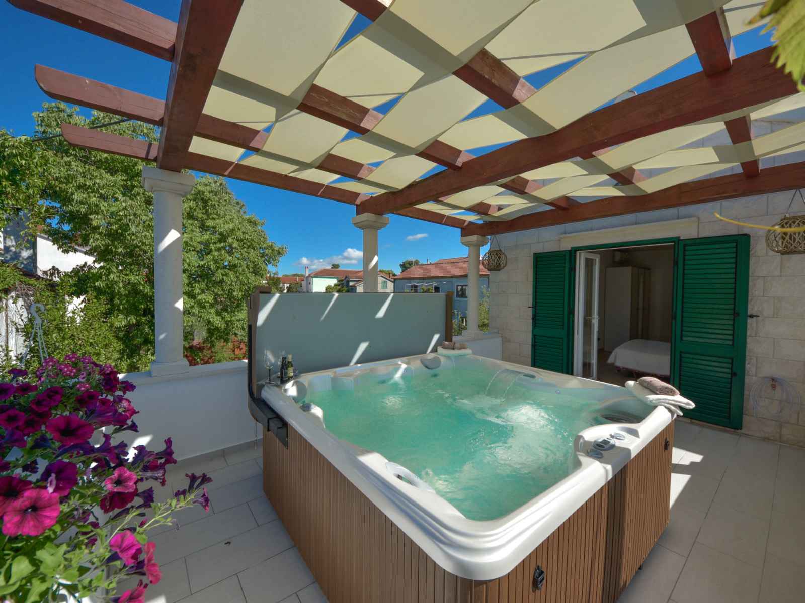 Belle maison individuelle accueillante pour les enfants "bila vila", de 2 étages, environnée par les arbres. dans le quartier de puntamika, à 800 m du centre de zadar, situation tranquille dans un quartier résidentiel, à 100 m de la mer, dans une impasse. a usage privé: terrain (clôturé), jardin avec pelouse et arbres. bain à remous ,