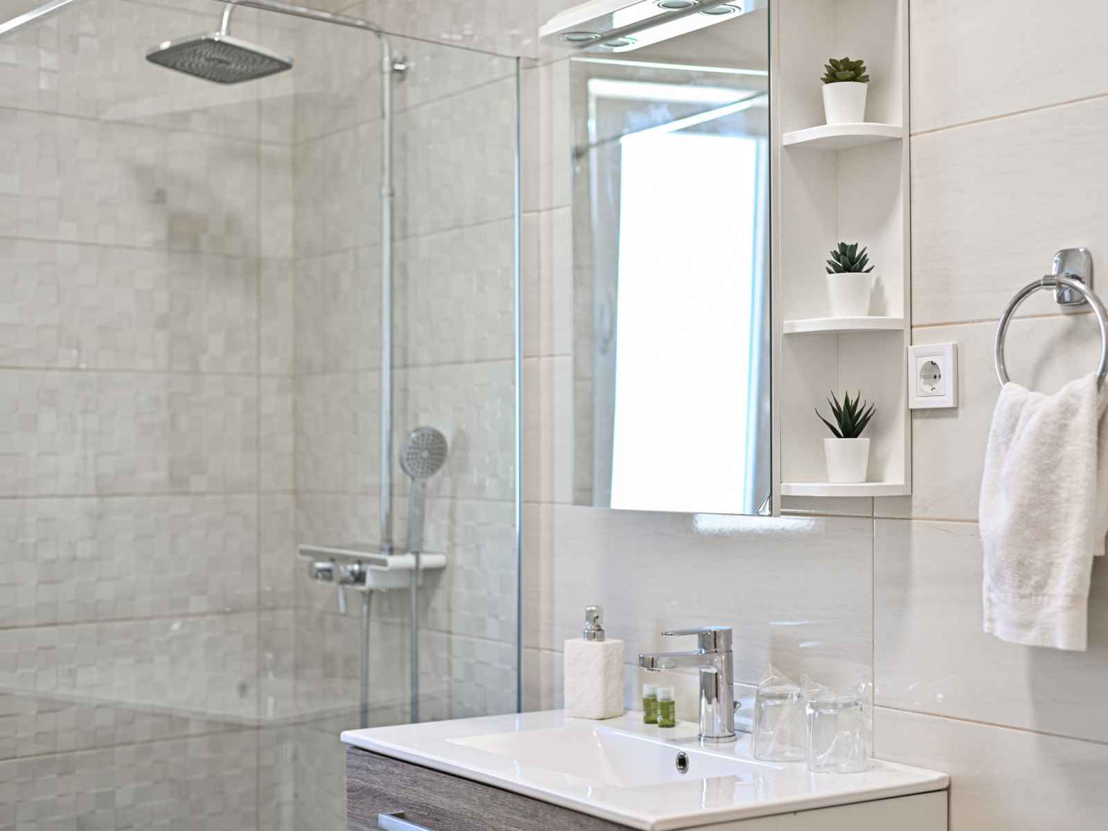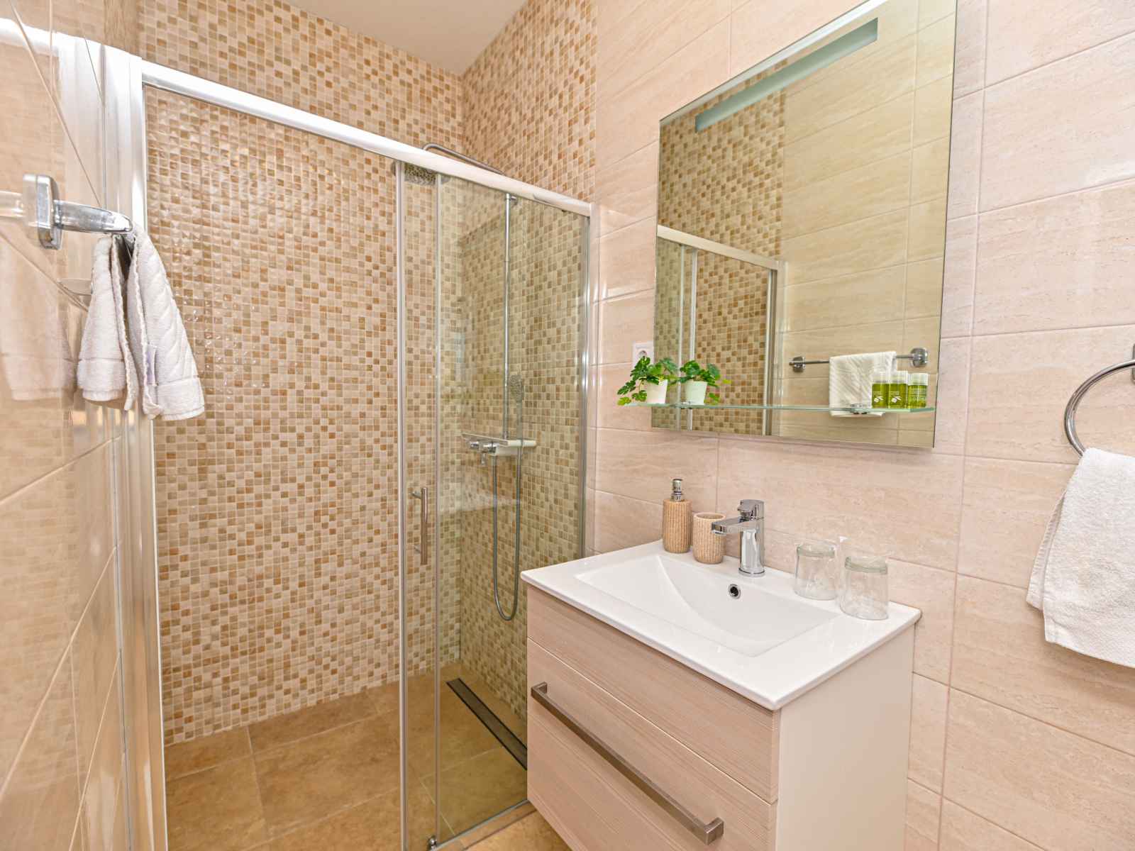 Maison 5 pièces 120 m2, situation sud. séjour/salle à manger 30 m2 avec tv (satellite) (écran plat), air-conditionné. sortie sur la terrasse. 2 chambres, chaque chambre avec: 1 grand-lit (180 cm, longueur 200 cm), douche/wc et air-conditionné. 1 chambre avec 2 lits (90 cm, longueur 200 cm), douche/wc et air-conditionné. cuisine ouverte