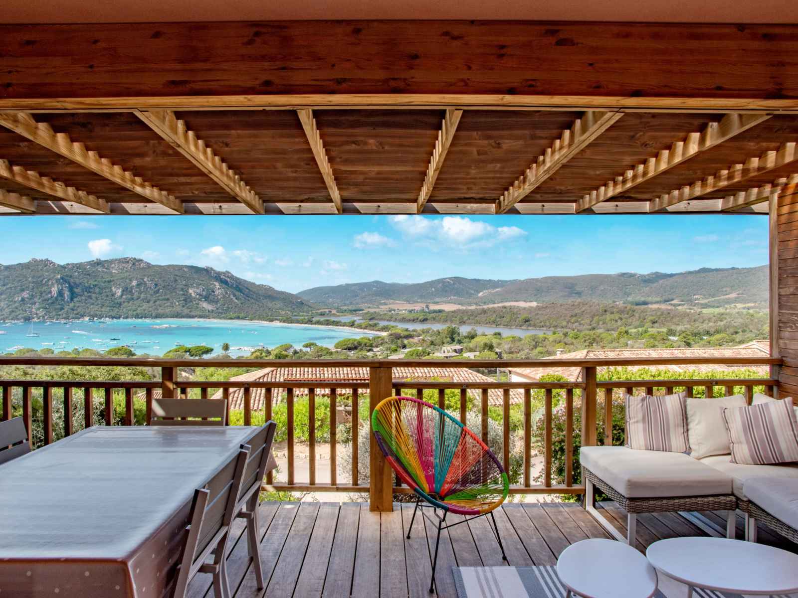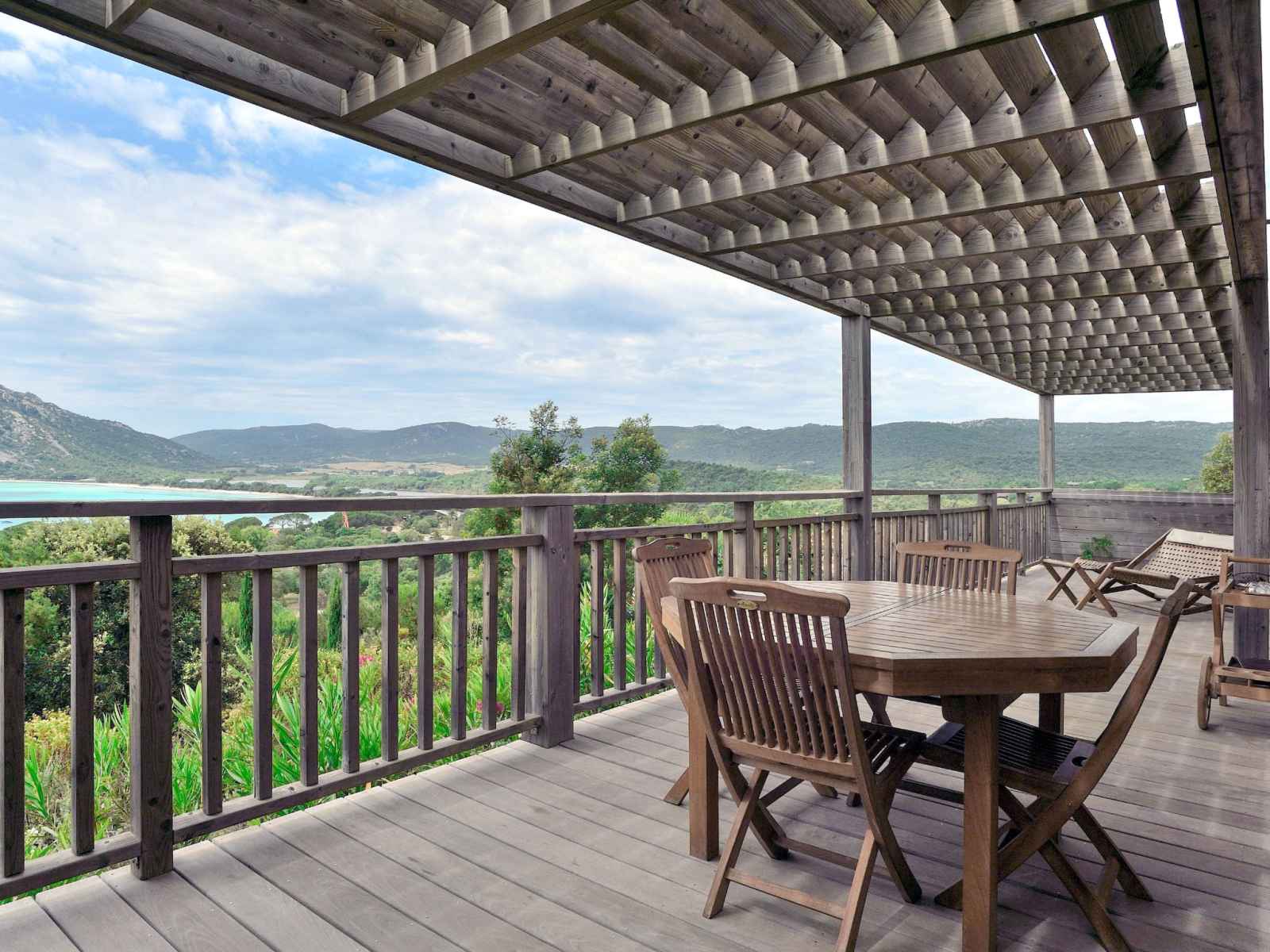 micro-ondes, congélateur, cafetière électrique). Douche/WC. À l'étage supérieur: 1 chambre avec 1 grand-lit (160 cm). Salle de bains, WC séparé. Chauffage électrique, air-conditionné. Balcon 18 m2, situation sud, terrasse 8 m2 partiellement couverte. Meubles de terrasse, mobilier de balcon, barbecue. Très belle vue panoramique sur la mer, les montagnes et Golfe de Santa Giulia, Bavella. A disposition: lave-linge. Veuillez noter: logement non-fumeur. Détecteur de fumée. Annonce d'un professionnel (art 155, IV du CGI) FR9210.658.3