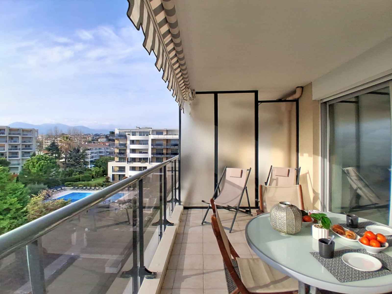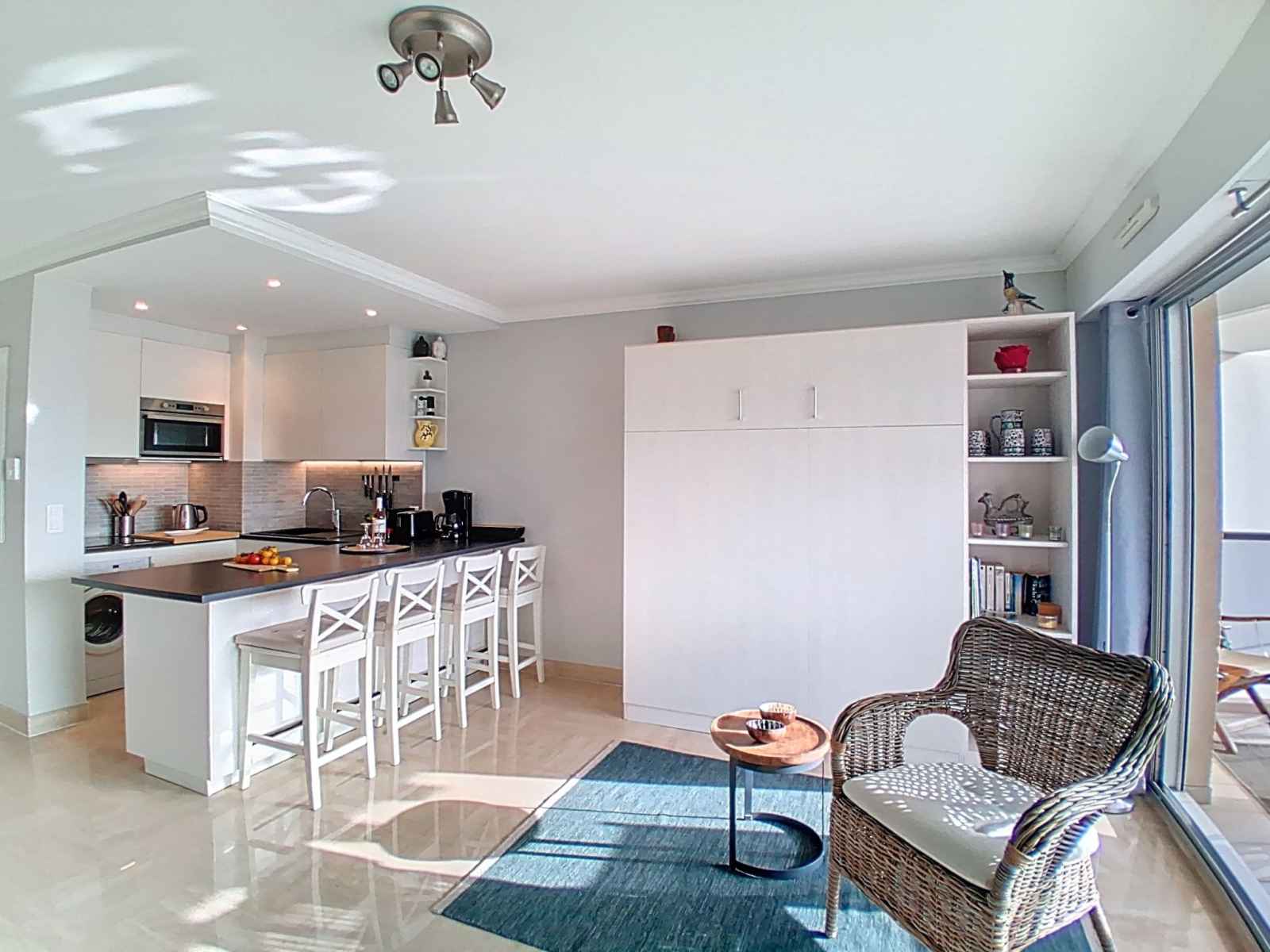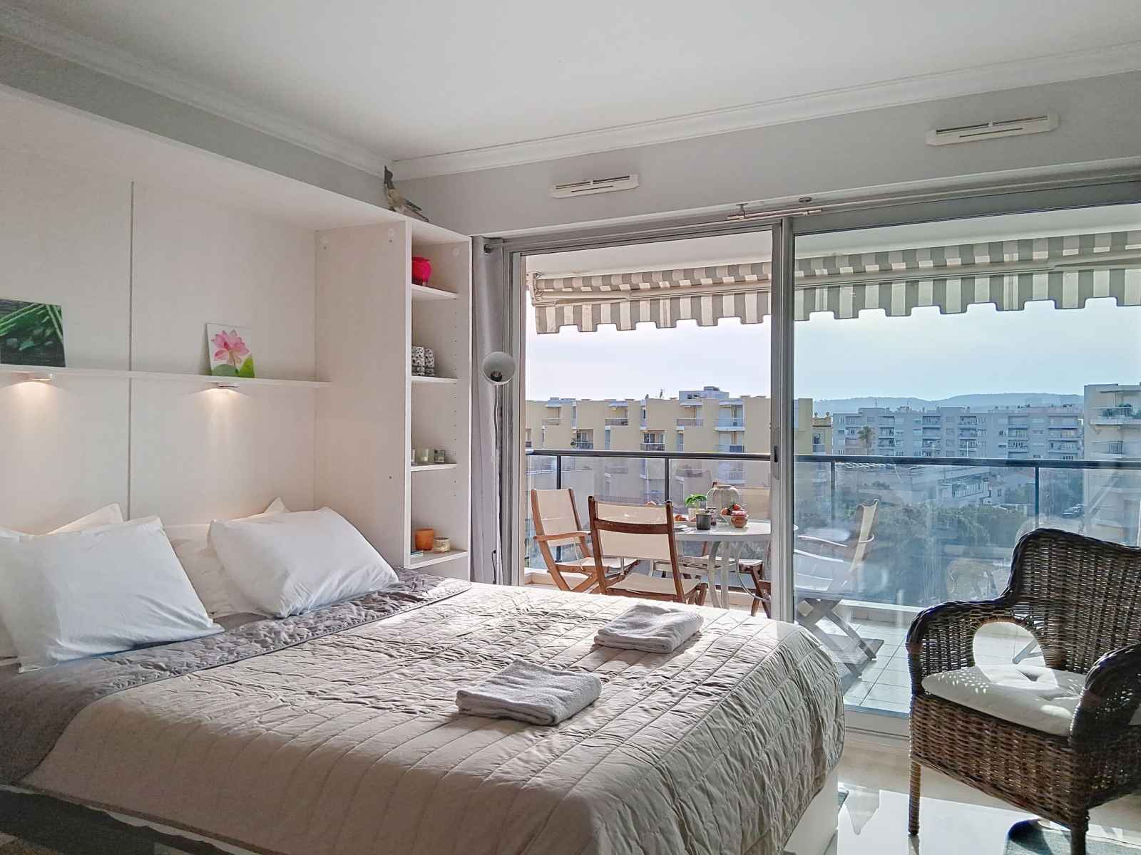 Capsules pour machine à café (NESPRESSO) (NON INCLUSES)). Sortie sur la terrasse. Douche/WC. Chauffage, air-conditionné. Grande terrasse 12 m2, situation sud et situation ouest. Meubles de terrasse. Très belle vue sur la mer, la piscine, le jardin et la localité. A disposition: lave-linge, fer à repasser, sèche-cheveux. Internet (Connexion WIFI, gratuit). Place de parking (1 Voiture). Veuillez noter: maison non-fumeur. Détecteur de fumée. Dans résidence de standing avec gardien. Annonce d'un particulier (art 155, IV du CGI). 06027027151DP