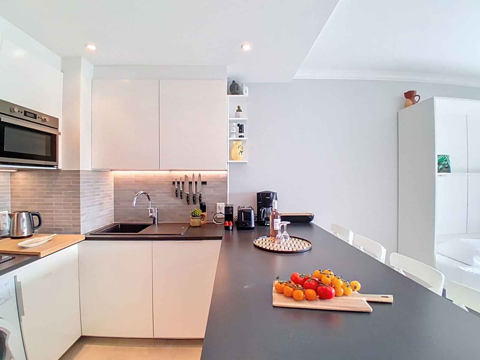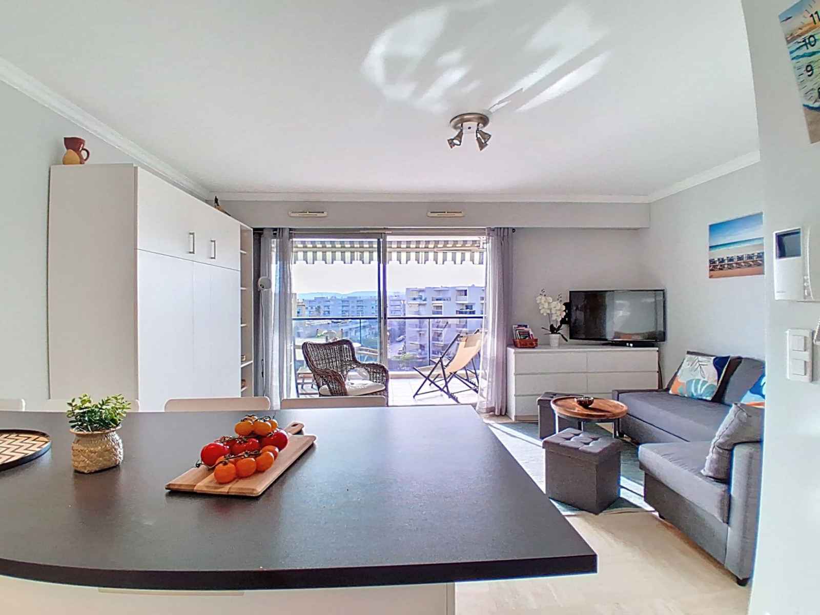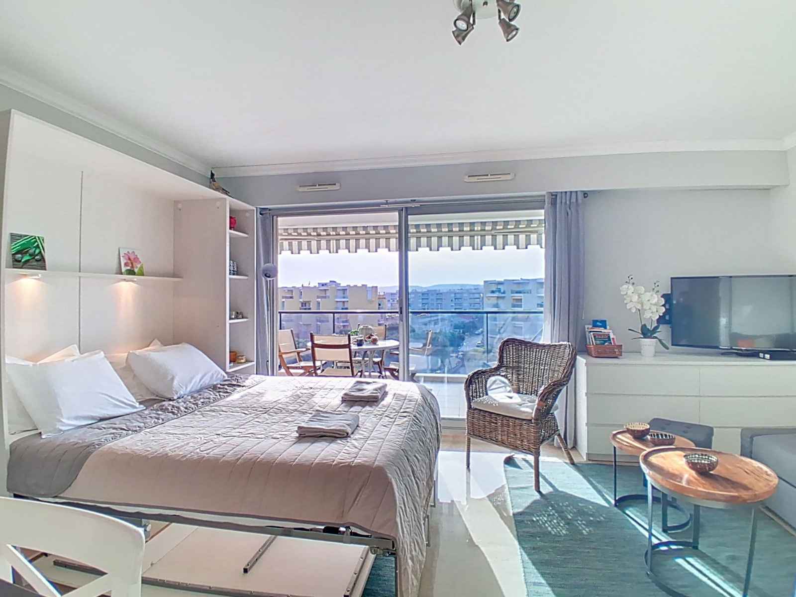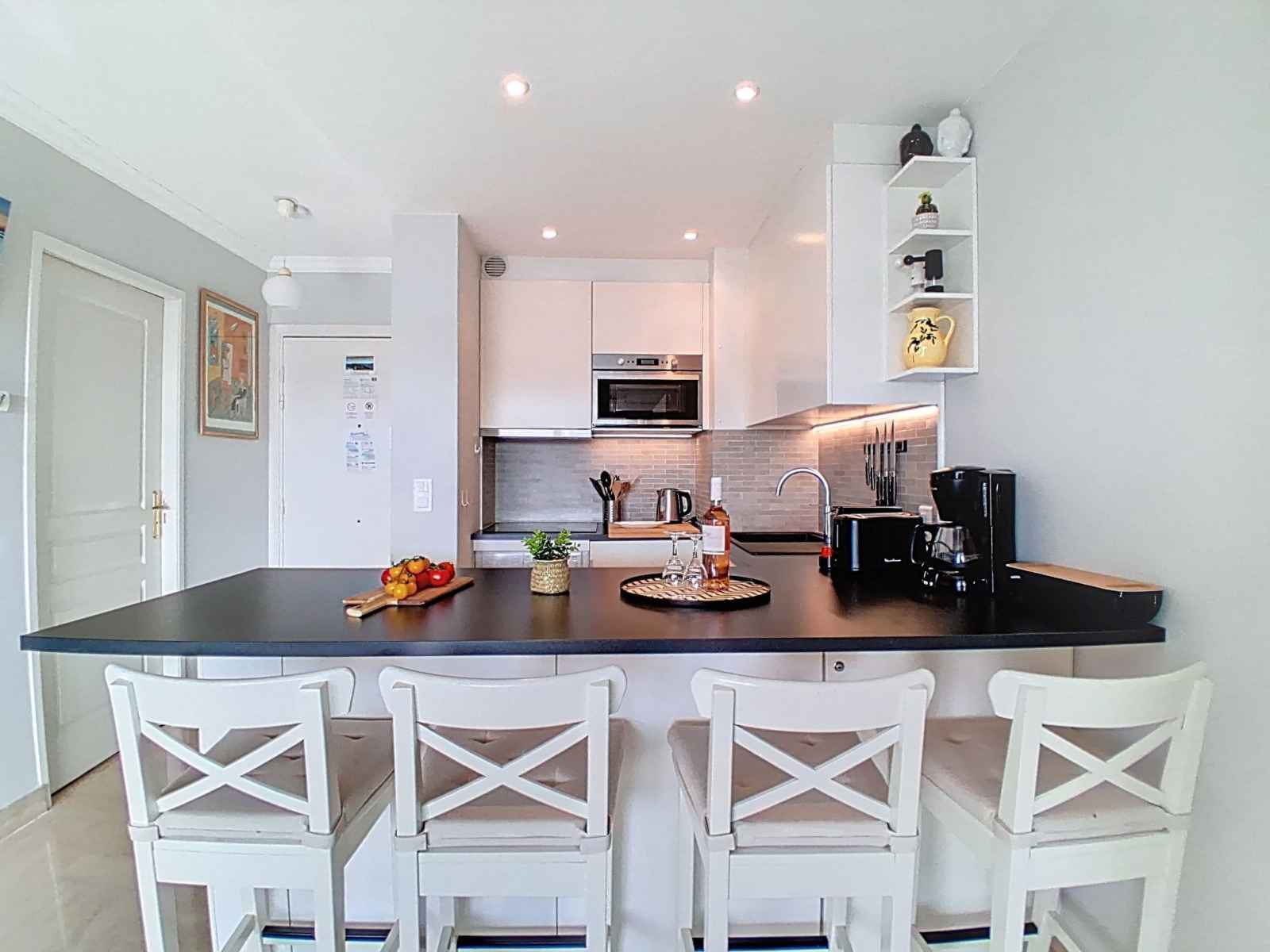 Studio 30 m2 au 5ème étage, situation sud-ouest. aménagement confortable et moderne: séjour/chambre à coucher avec 1 lit armoire (160 cm, longueur 200 cm), tv et écran plat. sortie sur la terrasse. cuisine ouverte (lave-vaisselle, 3 plaques à induction, grille-pain, bouilloire électrique, micro-ondes, congélateur, cafetière électrique,