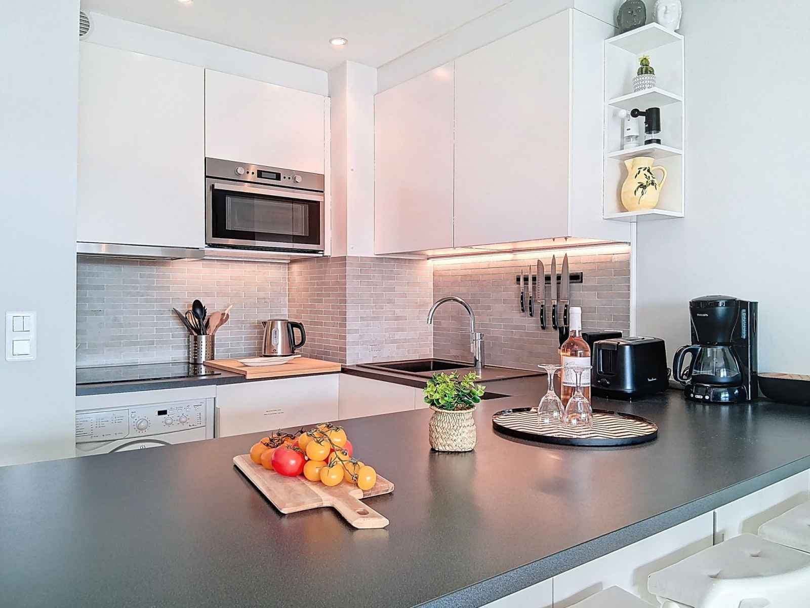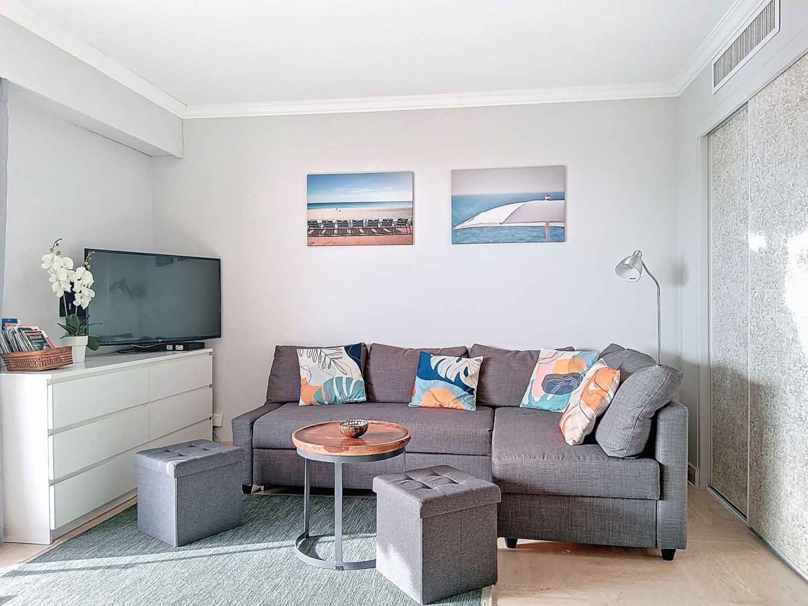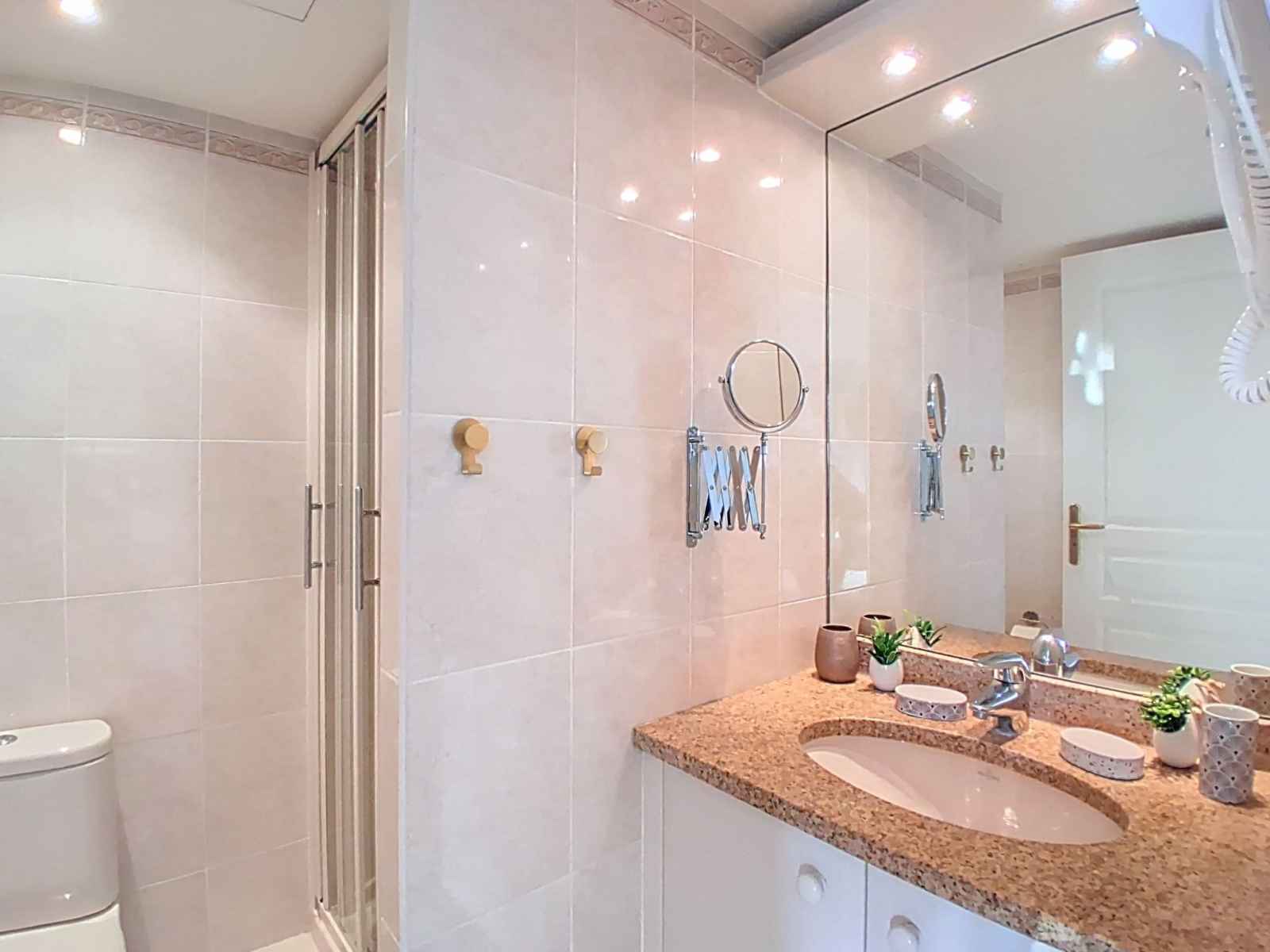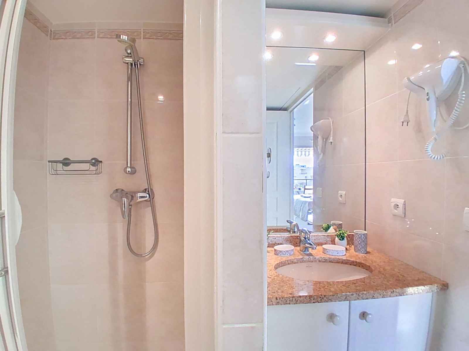 Studio 30 m2 au 5ème étage, situation sud-ouest. aménagement confortable et moderne: séjour/chambre à coucher avec 1 lit armoire (160 cm, longueur 200 cm), tv et écran plat. sortie sur la terrasse. cuisine ouverte (lave-vaisselle, 3 plaques à induction, grille-pain, bouilloire électrique, micro-ondes, congélateur, cafetière électrique,