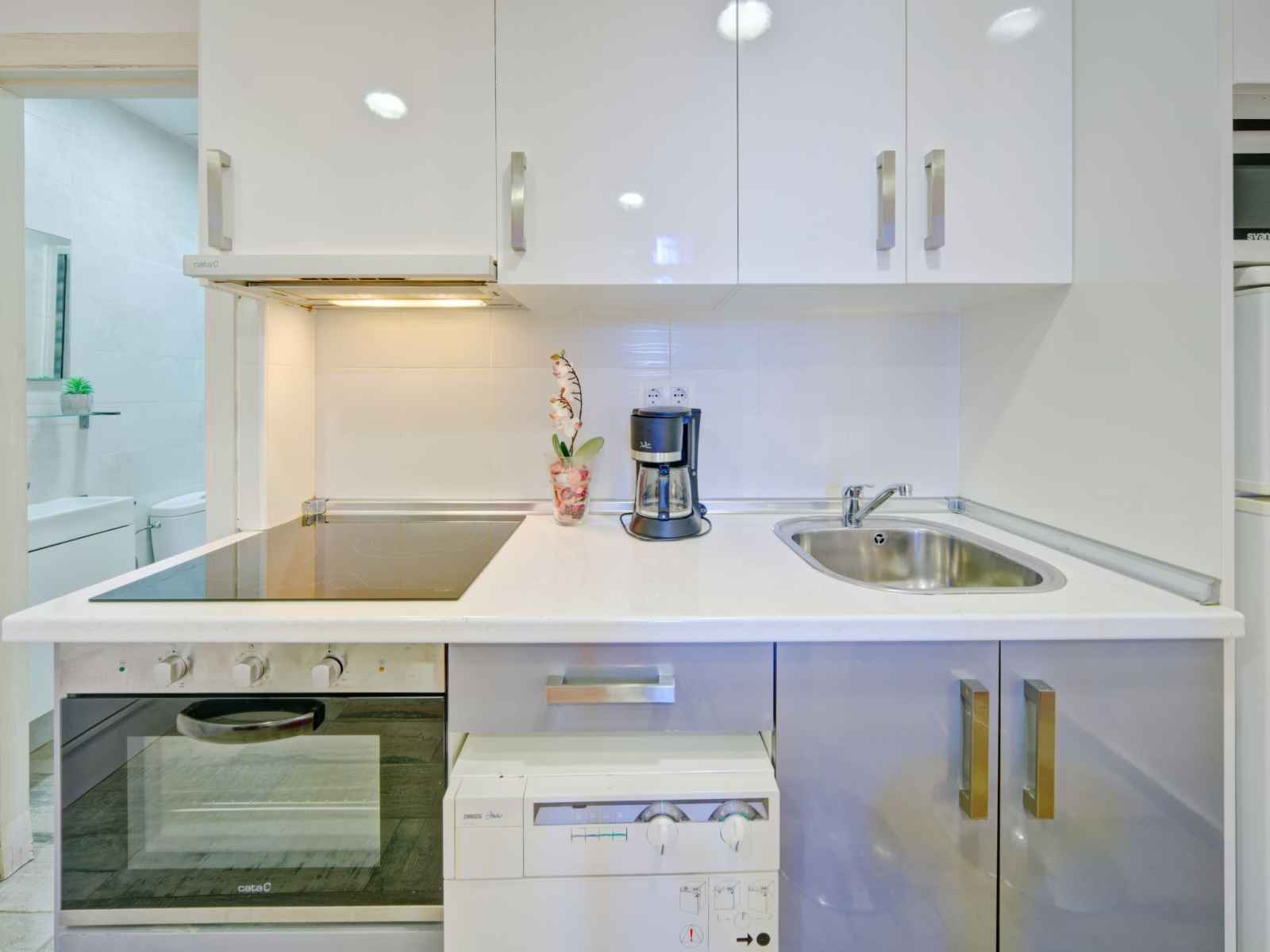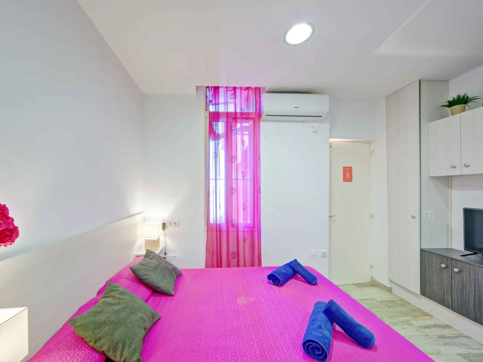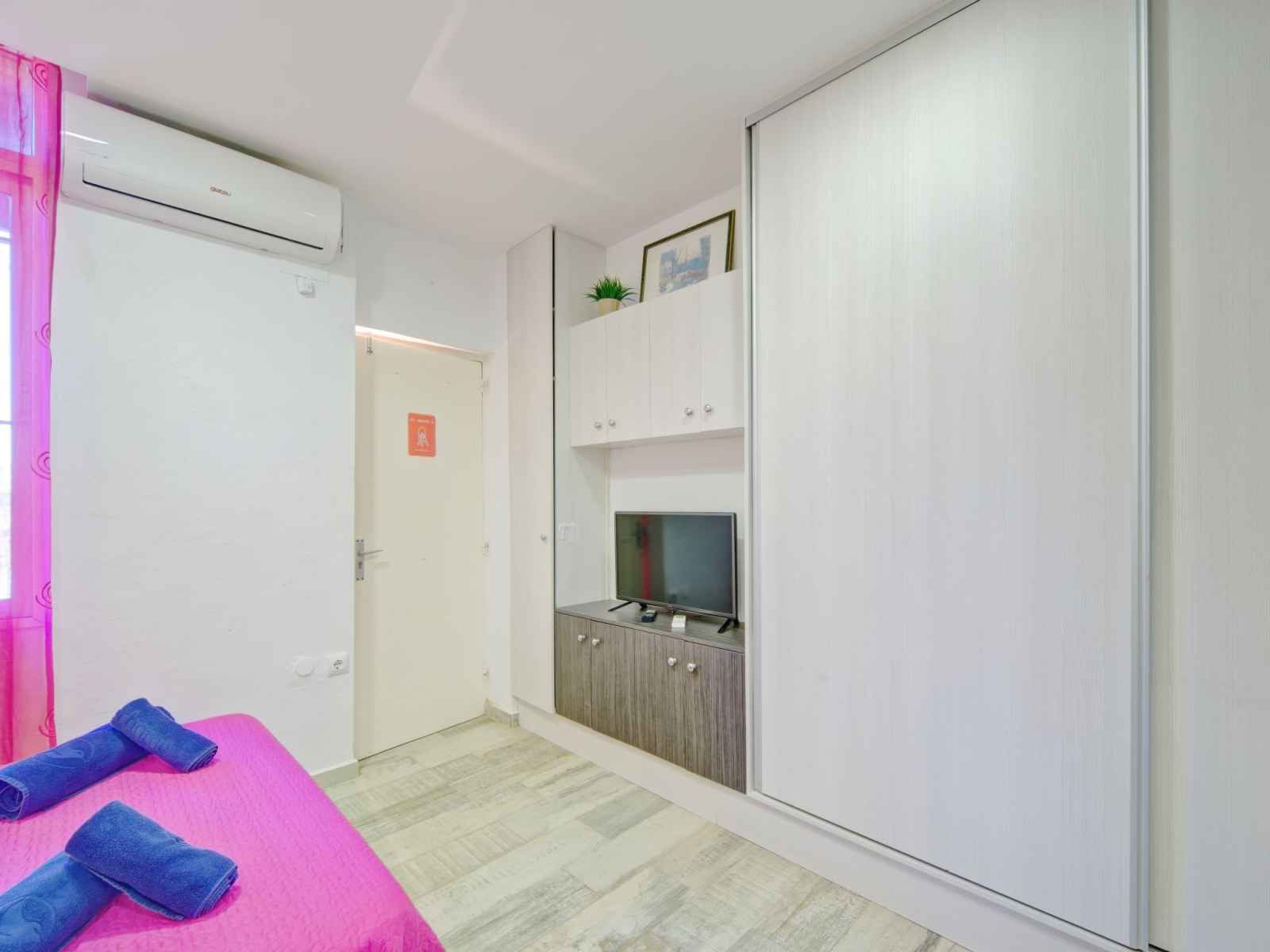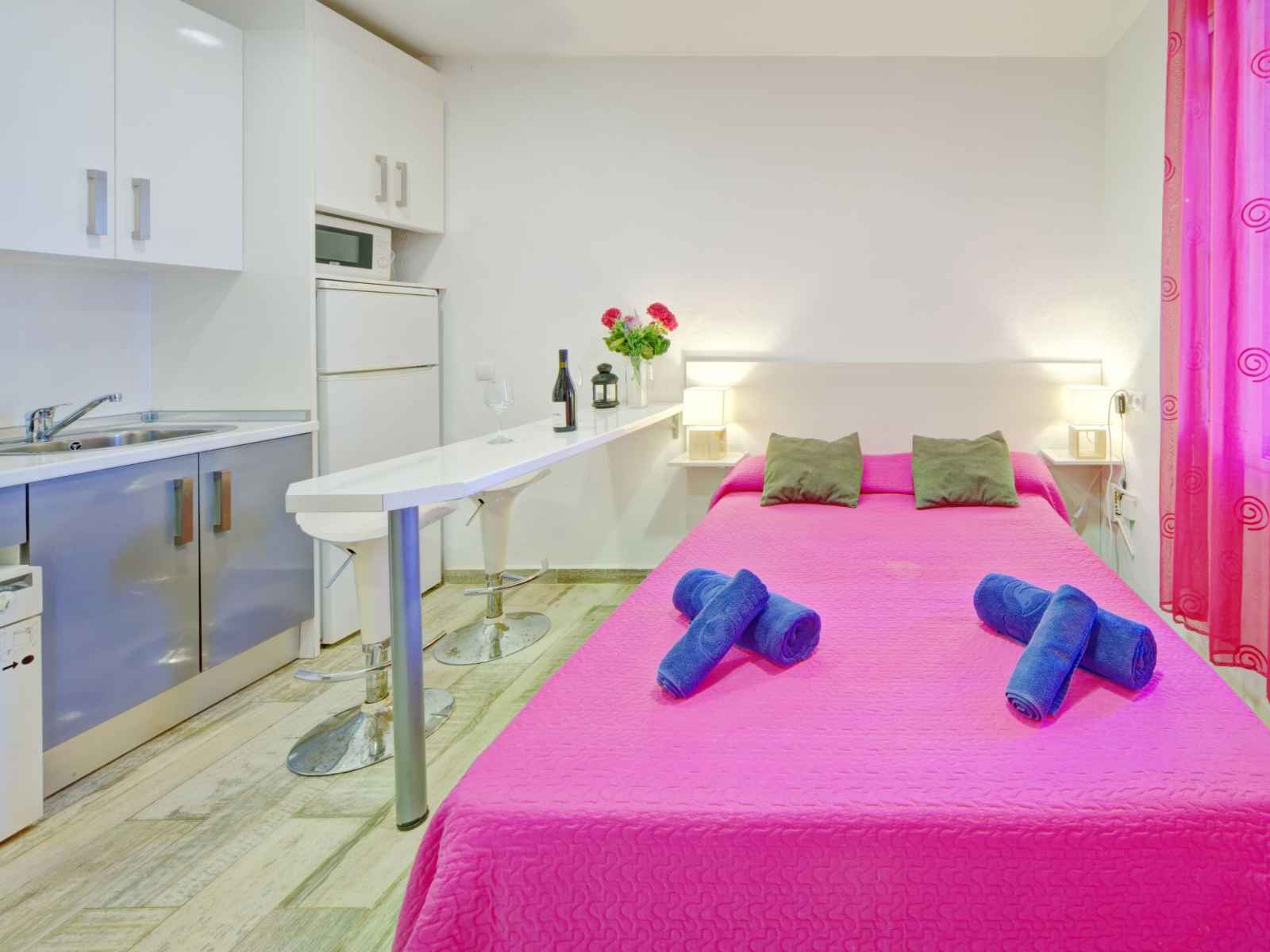"muralla roja" studio 16 m2 au 1er étage. logement idéal pour 2 adultes. aménagement fonctionnel et plaisant: séjour avec 1 grand-lit (135 cm, longueur 190 cm), télévision numérique, air-conditionné et chauffage à air chaud. cuisine ouverte (four, lave-vaisselle, 3 plaques vitrocéramiques, grille-pain, bouilloire électrique,