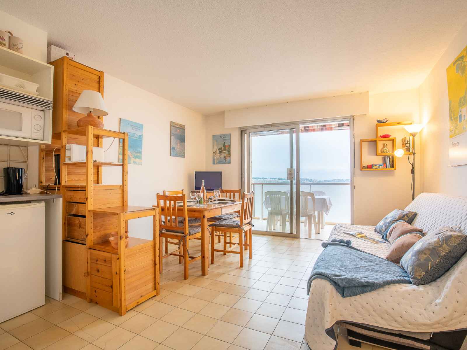 Studio 28 m2 au 5ème étage. logement idéal pour 2 adultes + 2 enfants. séjour/salle à manger avec 1 divan-lit double (1 x 140 cm, longueur 190 cm), tv. alcôve avec 1 x 2 lits superposés (90 cm, longueur 190 cm), radiateur électrique. coin cuisine (2 plaques vitrocéramiques, grille-pain, bouilloire électrique, micro-ondes, cafetière
