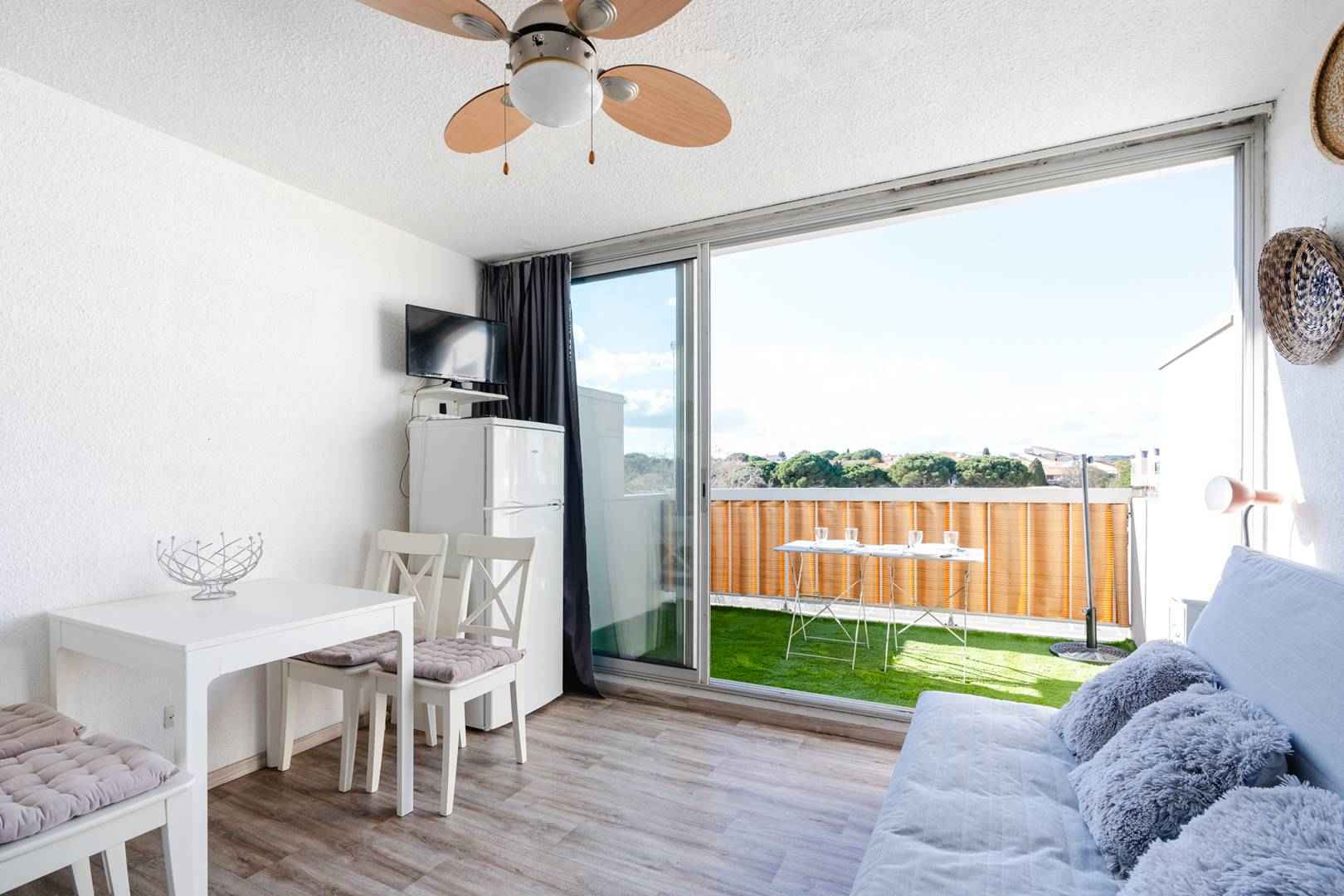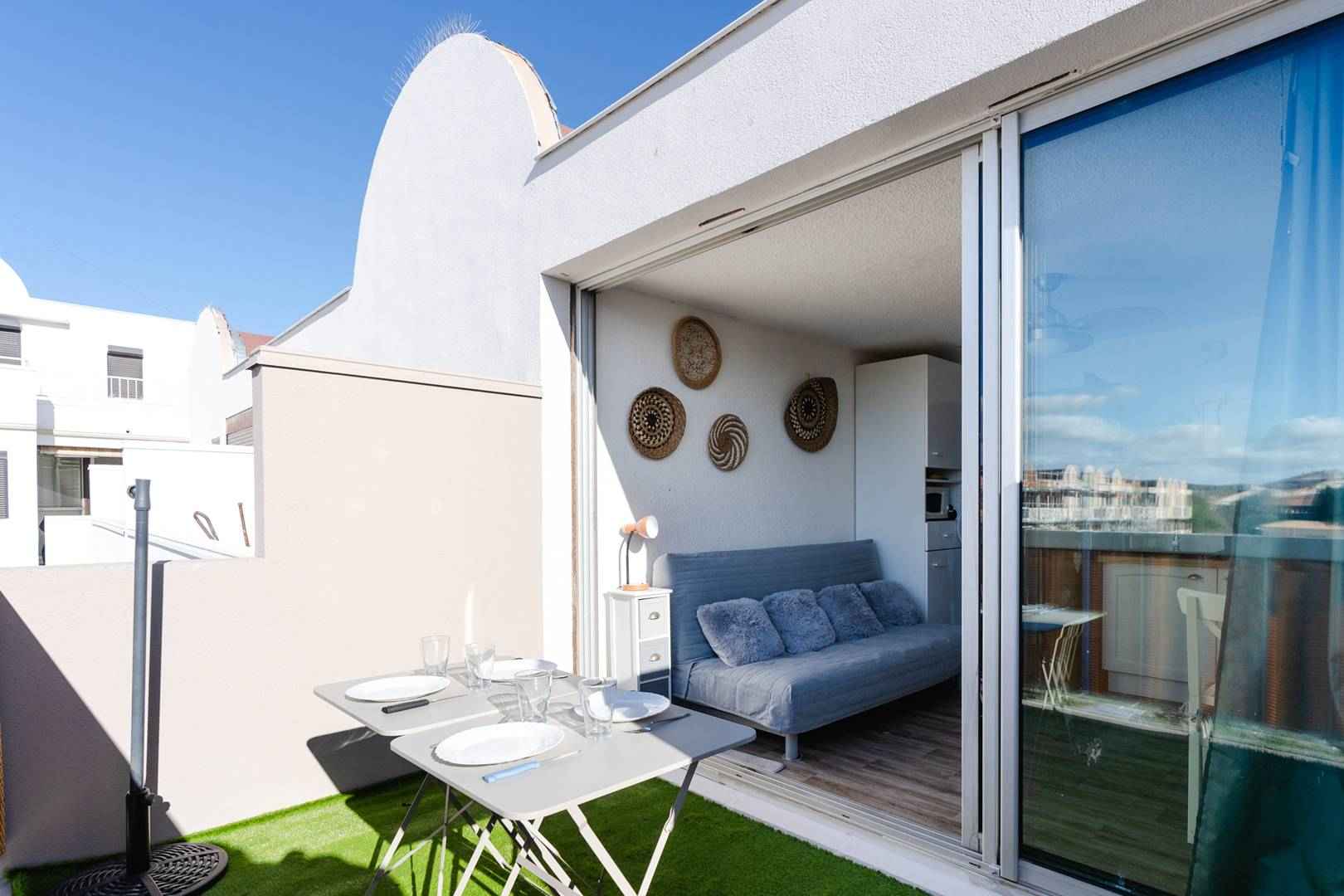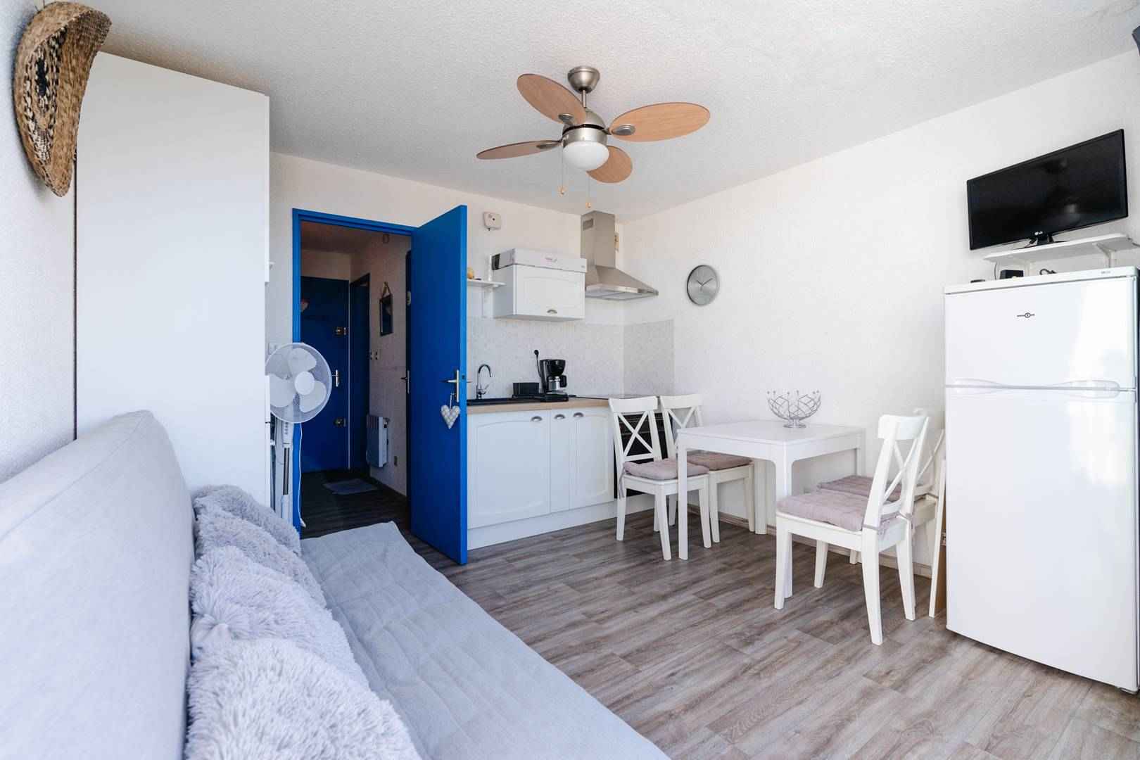 séparés, d'un séjour-cuisine (four, micro-ondes, plaque de cuisson, réfrigérateur, cafetière) , une table et 4 chaises et canapé-lit (clic-clac) , TV (chaînes françaises et TNT), et d'un beau balcon de 7m². Local à vélo dans la résidence.