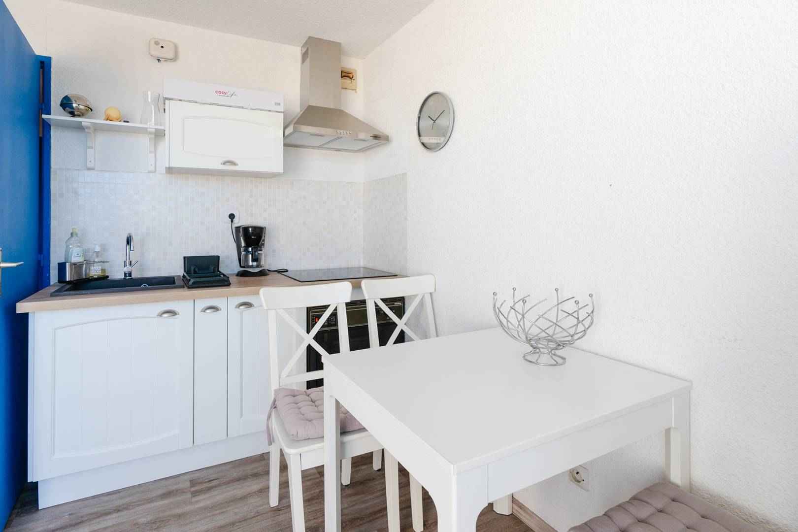 cet appartement climatisé se compose d'une entrée avec 2 lits superposés (90x190), d'une salle d'eau (douche à l'italienne, meuble de rangement sous vasque), wc