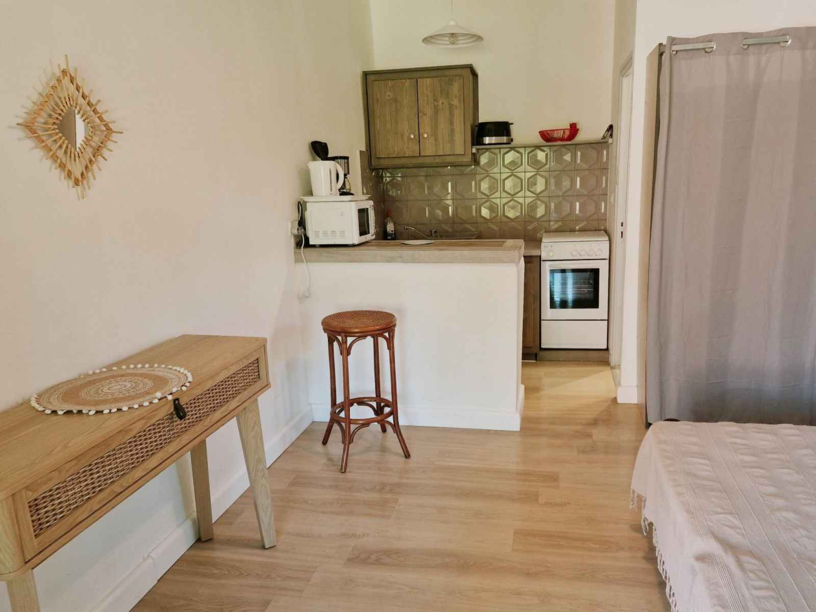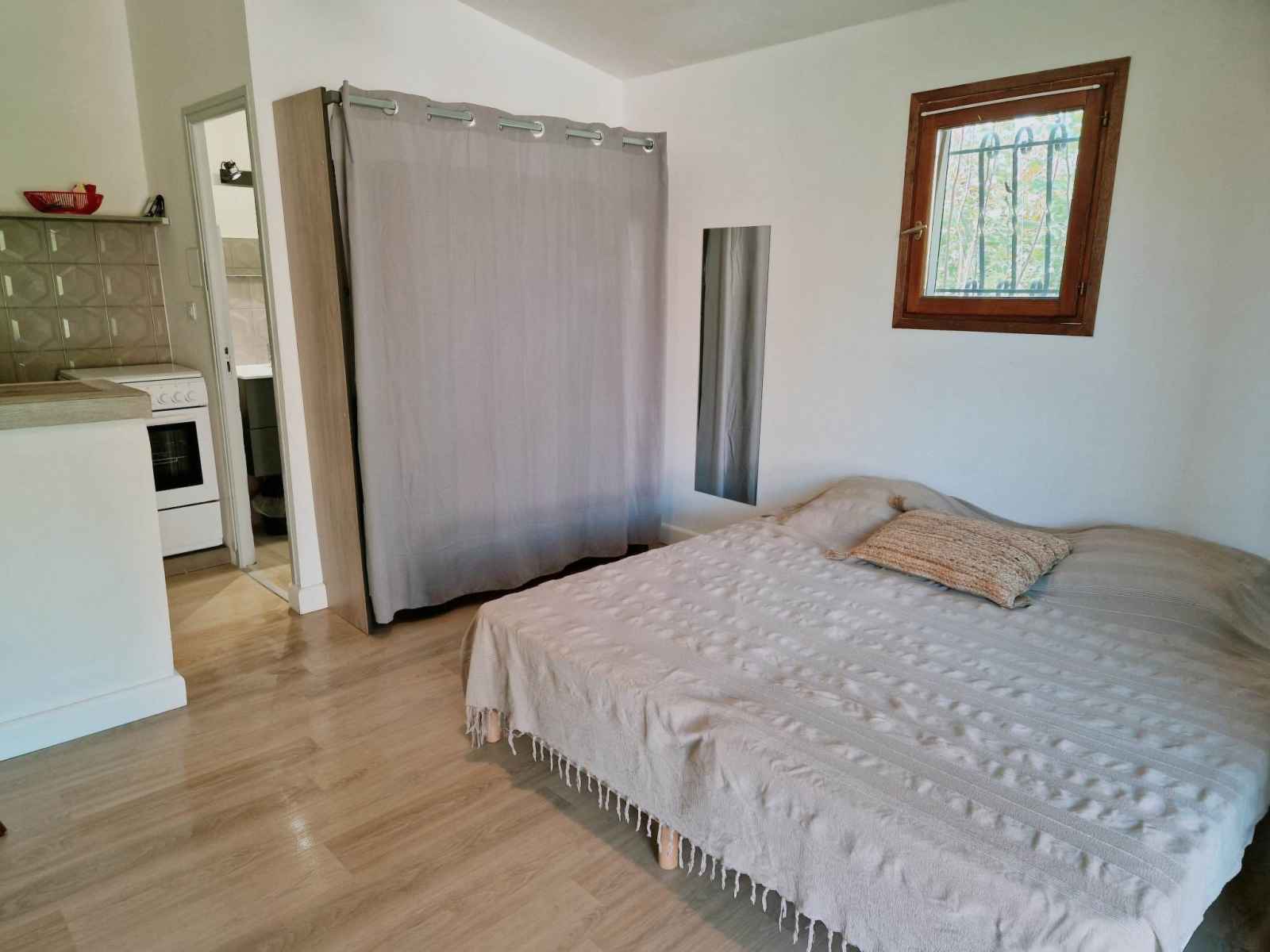 "studio 2 personnes" studio 24 m2. aménagement fonctionnel et confortable: séjour/chambre à coucher avec 2 lits (90 cm, longueur 190 cm), chauffage électrique et air-conditionné. sortie sur le jardin, sur la terrasse. coin cuisine (four, 2 feux, grille-pain, bouilloire électrique, micro-ondes, cafetière électrique) avec table pour les