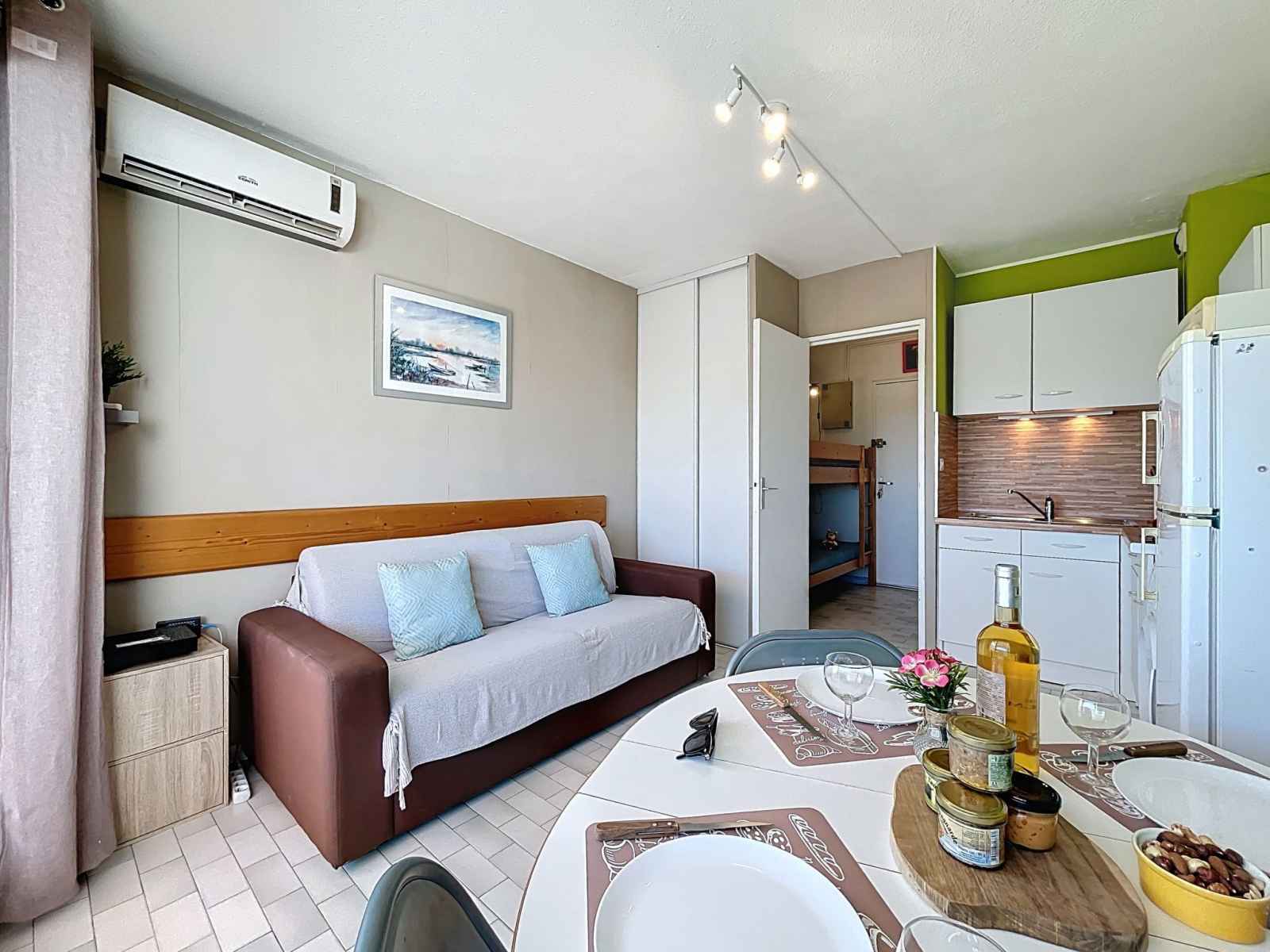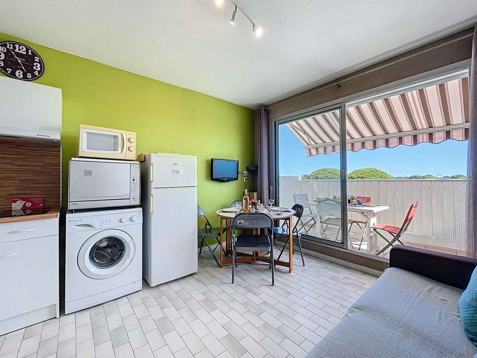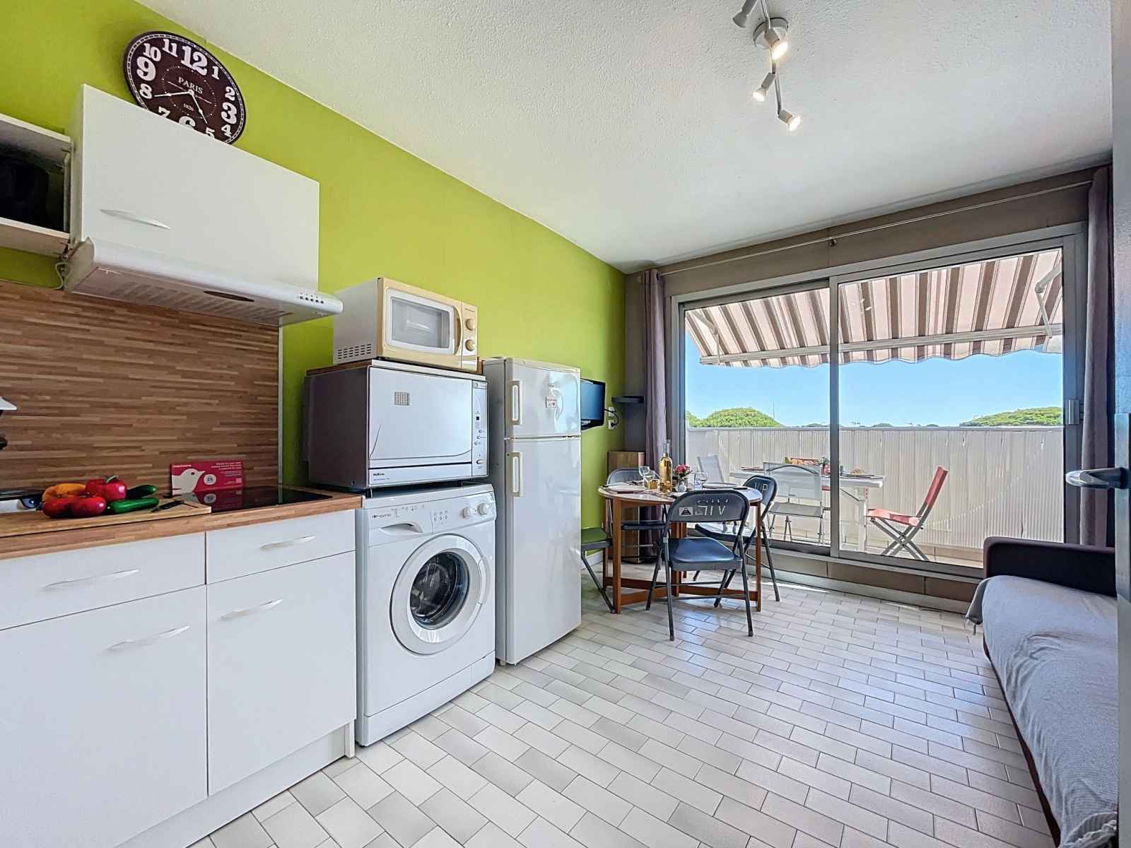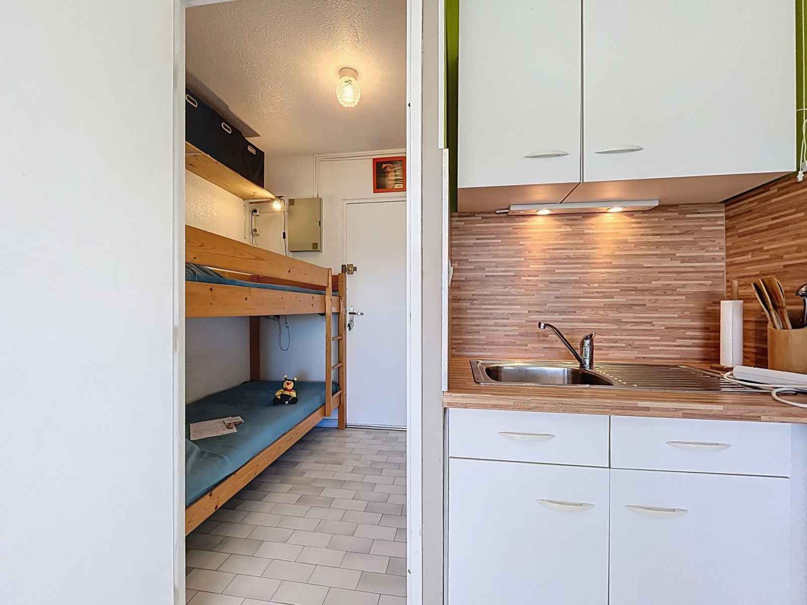 "le santa maria" studio 20 m2 au 2ème étage. logement idéal pour 2 adultes + 2 enfants. séjour/chambre à coucher avec 1 divan-lit double (140 cm, longueur 190 cm), tv (écran plat). sortie sur le balcon. cabine avec 1 x 2 lits superposés (90 cm, longueur 190 cm). coin cuisine (lave-vaisselle, 2 plaques vitrocéramiques, grille-pain,