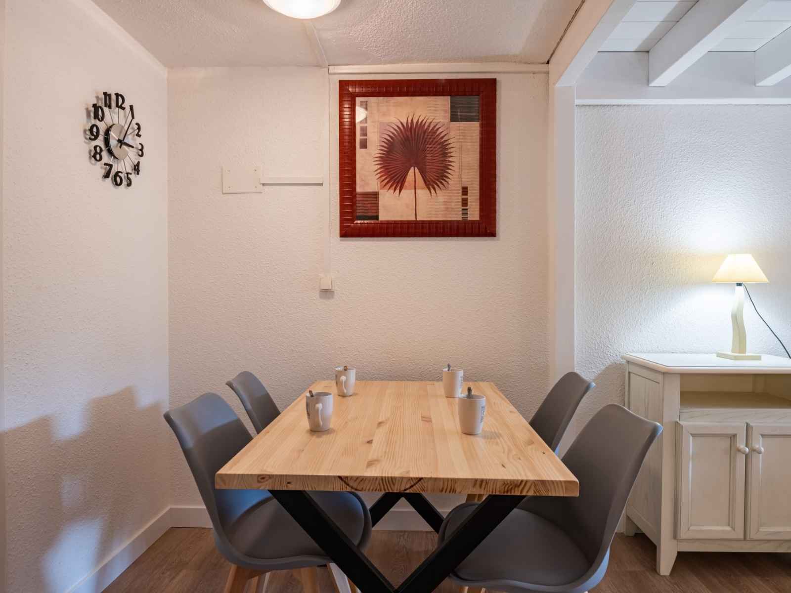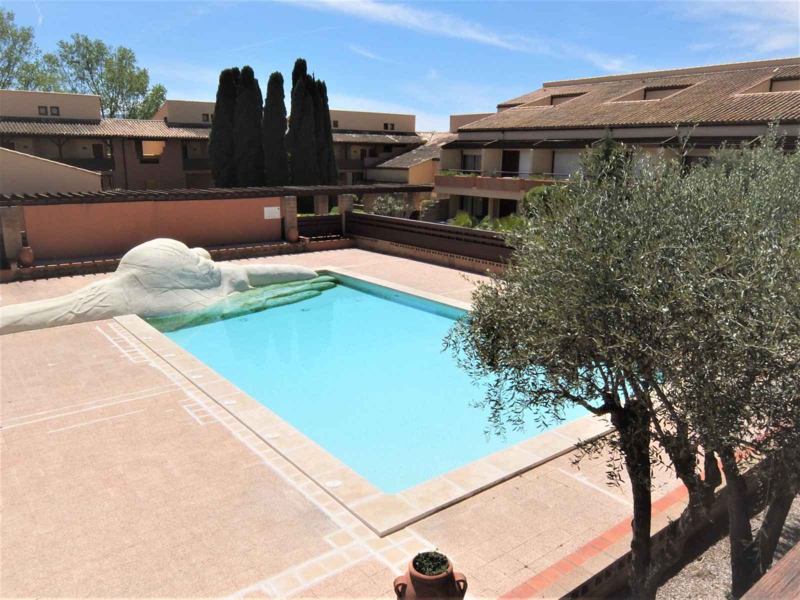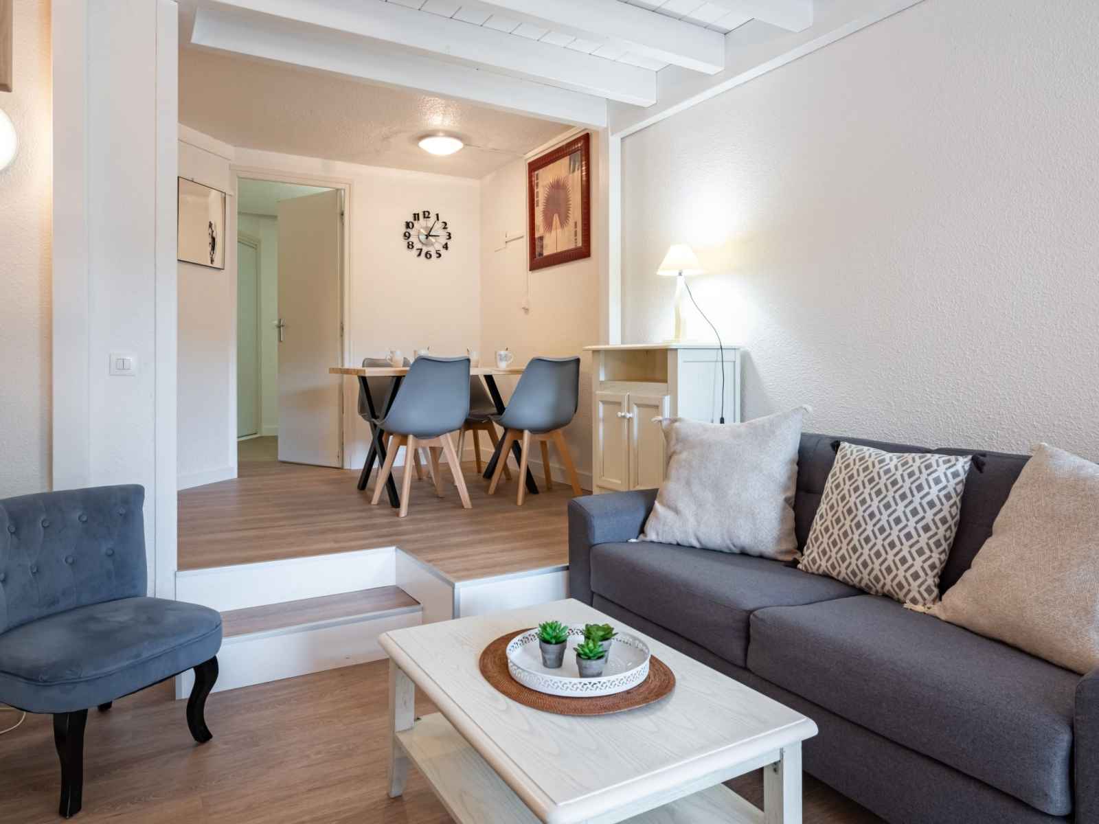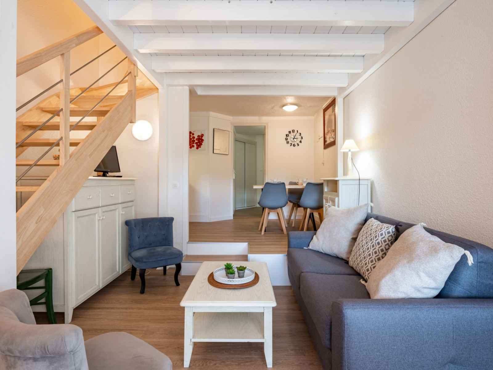 Studio 28 m2 sur 2 niveaux au 1er étage. partiellement rénové en 2022: séjour/salle à manger avec 1 divan-lit double (140 cm, longueur 180 cm), tv (écran plat). sortie sur la terrasse. coin cuisine (lave-vaisselle, 2 plaques vitrocéramiques, micro-ondes, congélateur, cafetière électrique). salle de bains, wc séparé. chauffage. À