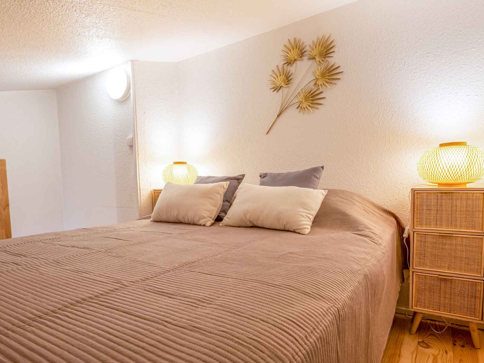 l'étage supérieur: galerie mansardée, hauteur plafond 130 - 200 cm avec 1 grand-lit (140 cm, longueur 190 cm). Terrasse 10 m2, situation est. Meubles de terrasse. A disposition: Internet (Connexion WIFI, en sus). Veuillez noter: détecteur de fumée. Au lieu d'une chambre fermée, des espaces de couchage sont situés dans une zone ouverte (galerie, alcôve...).