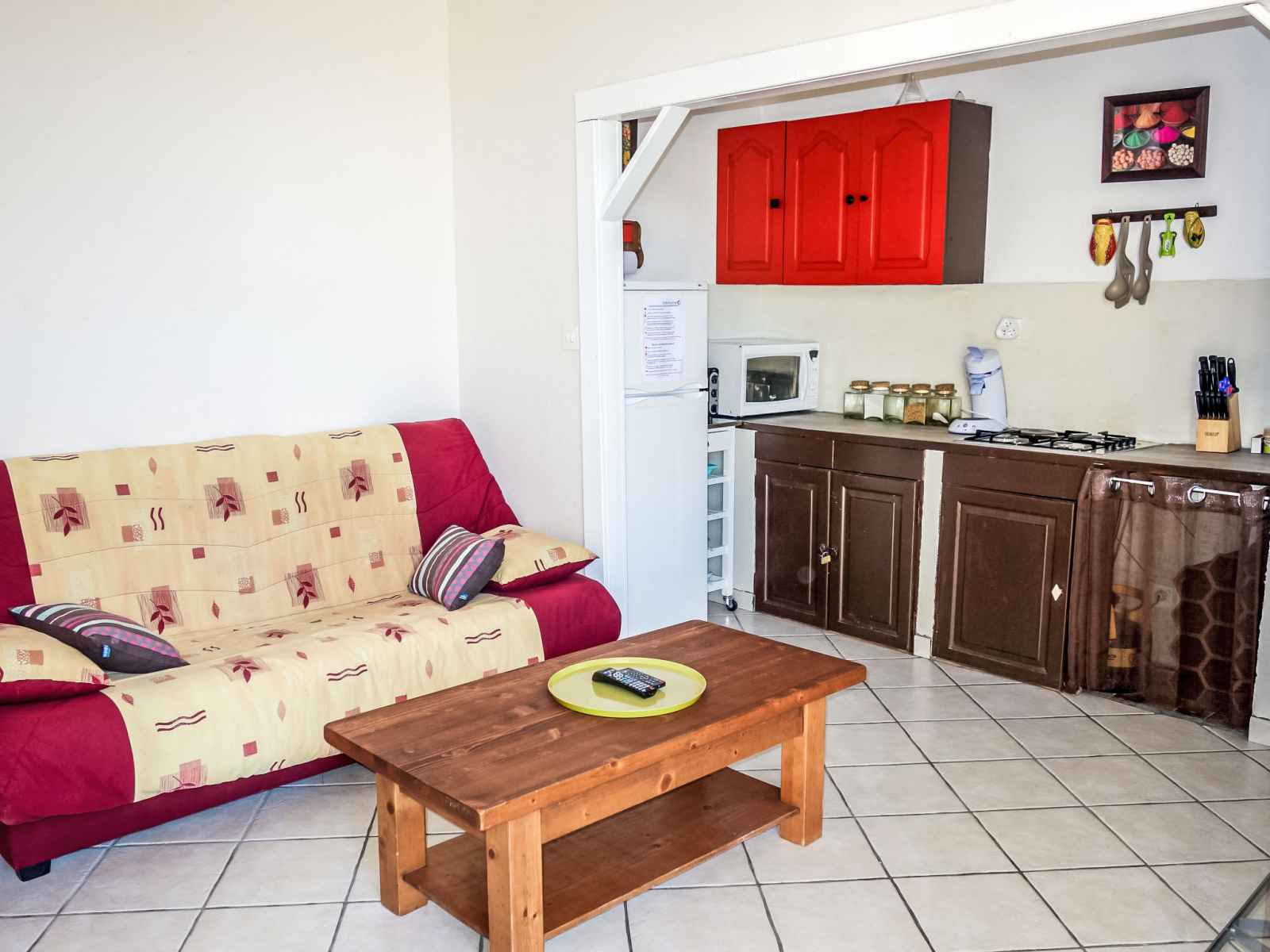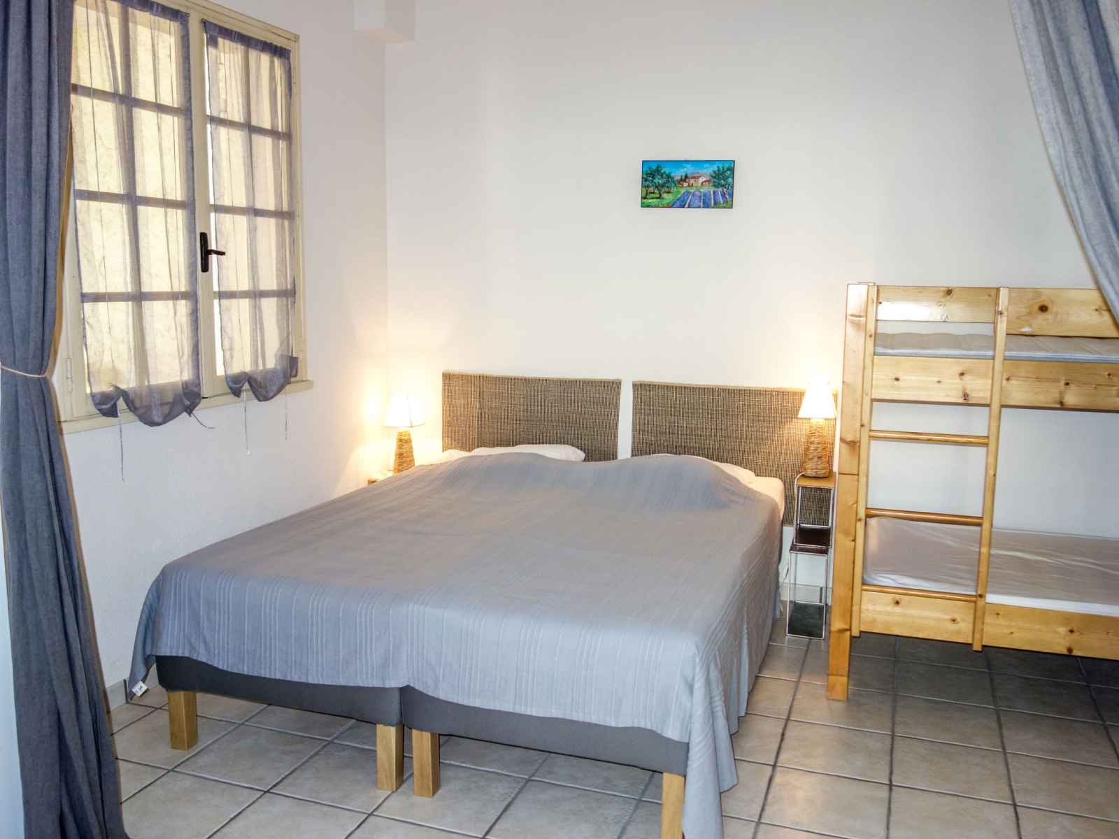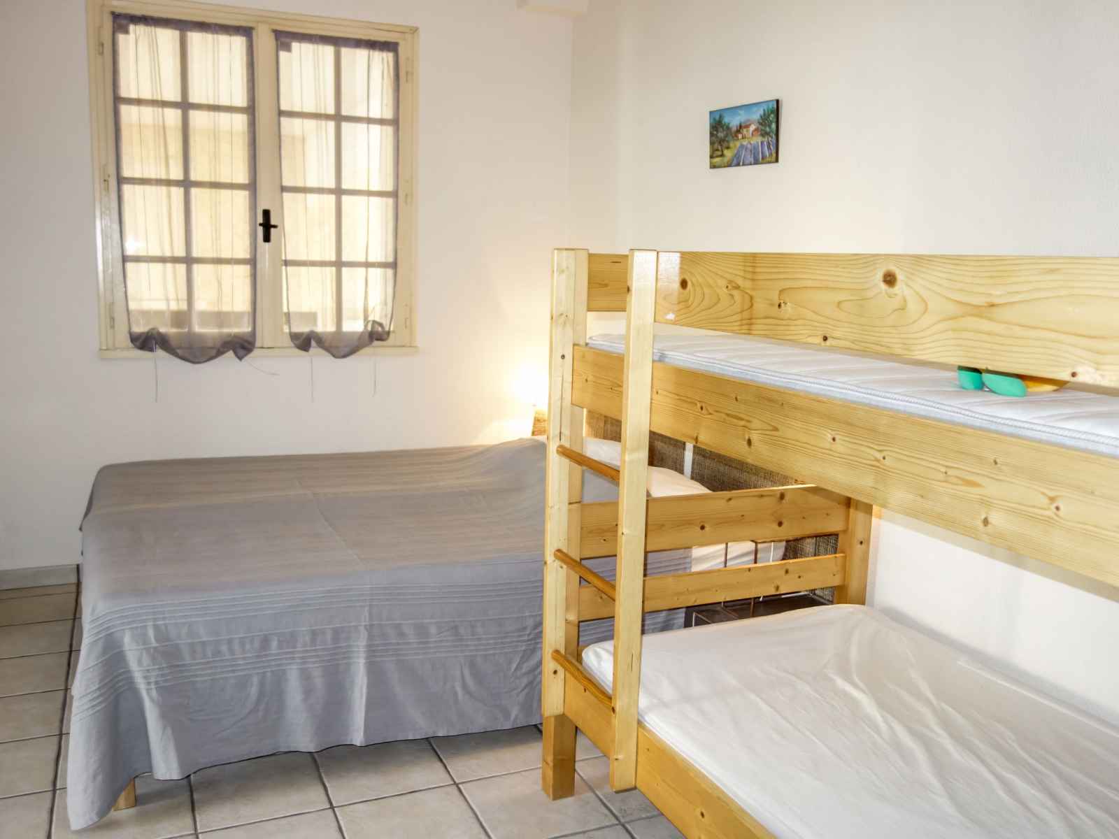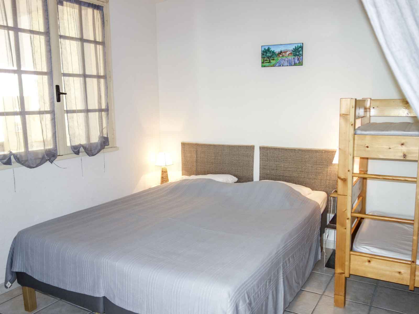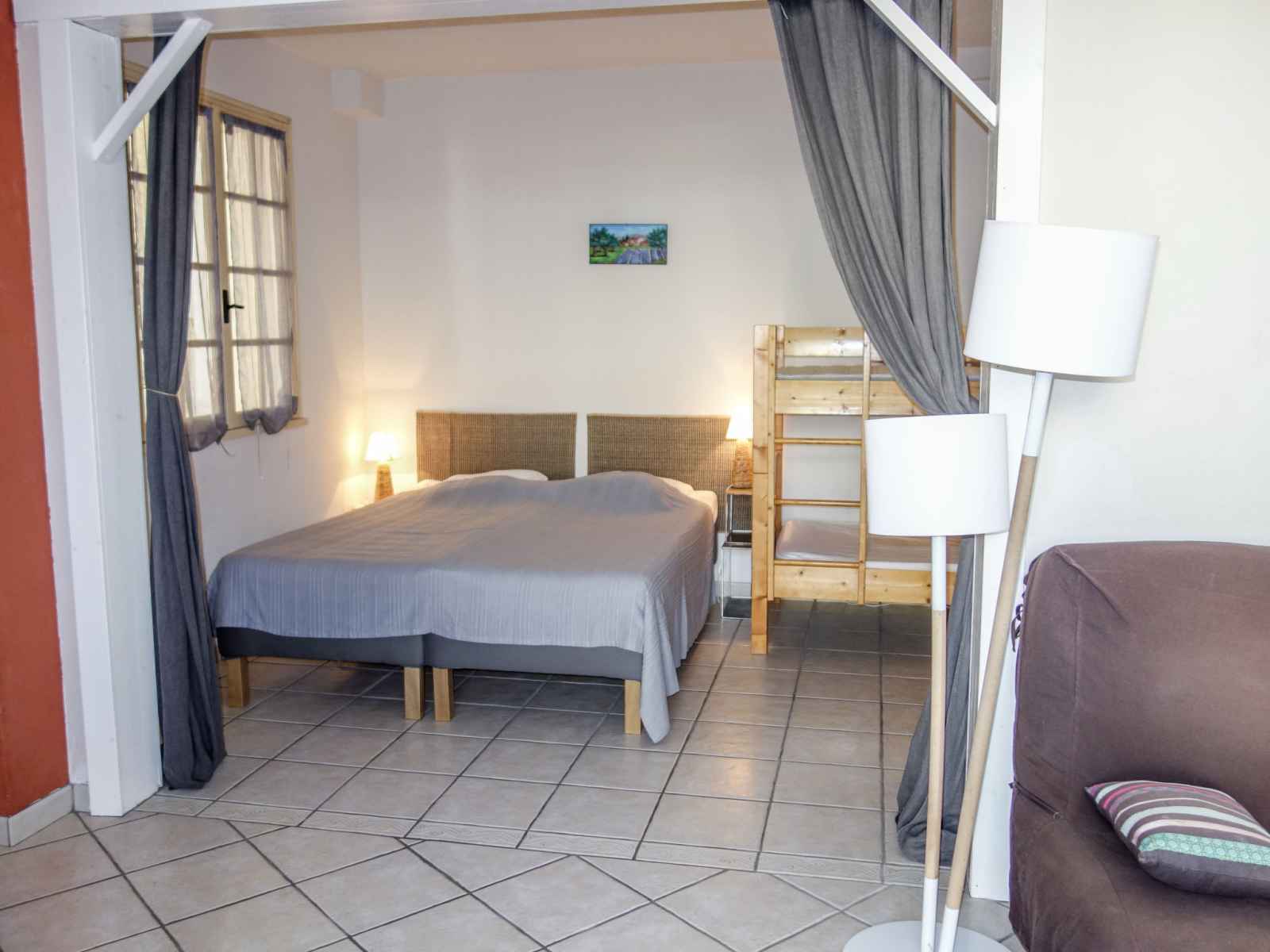 Studio 45 m2 au 1er étage. aménagement confortable et agréable: séjour/salle à manger avec tv (écran plat). sortie sur la terrasse. 1 grande chambre avec rideau avec 1 x 2 lits superposés (80 cm, longueur 190 cm), 1 lit double (2 x 78 cm, longueur 200 cm). cuisine ouverte (4 plaques de cuisson, mini-four, micro-ondes, congélateur,