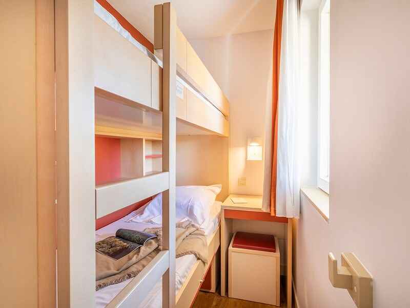 - pièce à vivre : 1 canapé lit double (160cm x 200cm) et 1 coin nuit avec 2 lits superposés (recommandés pour les enfants)