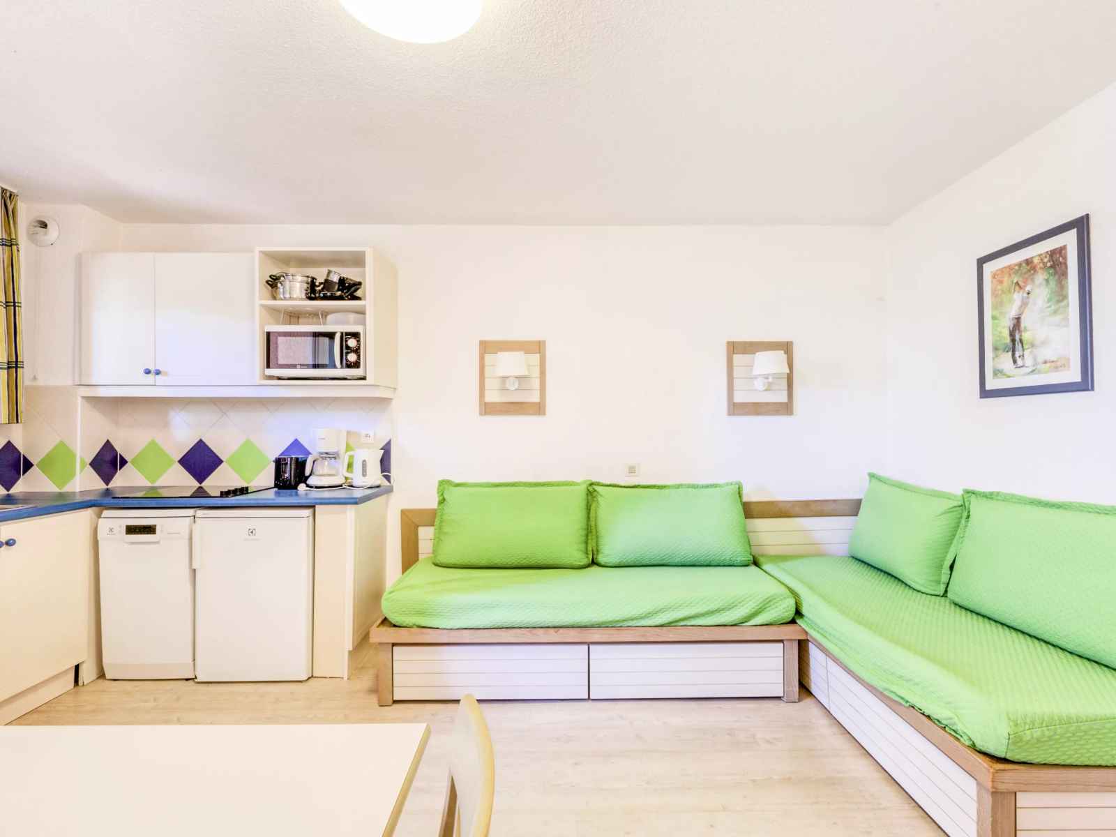 • Cuisine : Bouilloire, Cafetière, Grille-pain, Lave-vaisselle, Plaque de cuisson, Réfrigérateur, Vaisselle et couverts