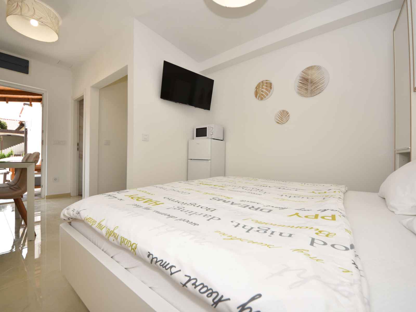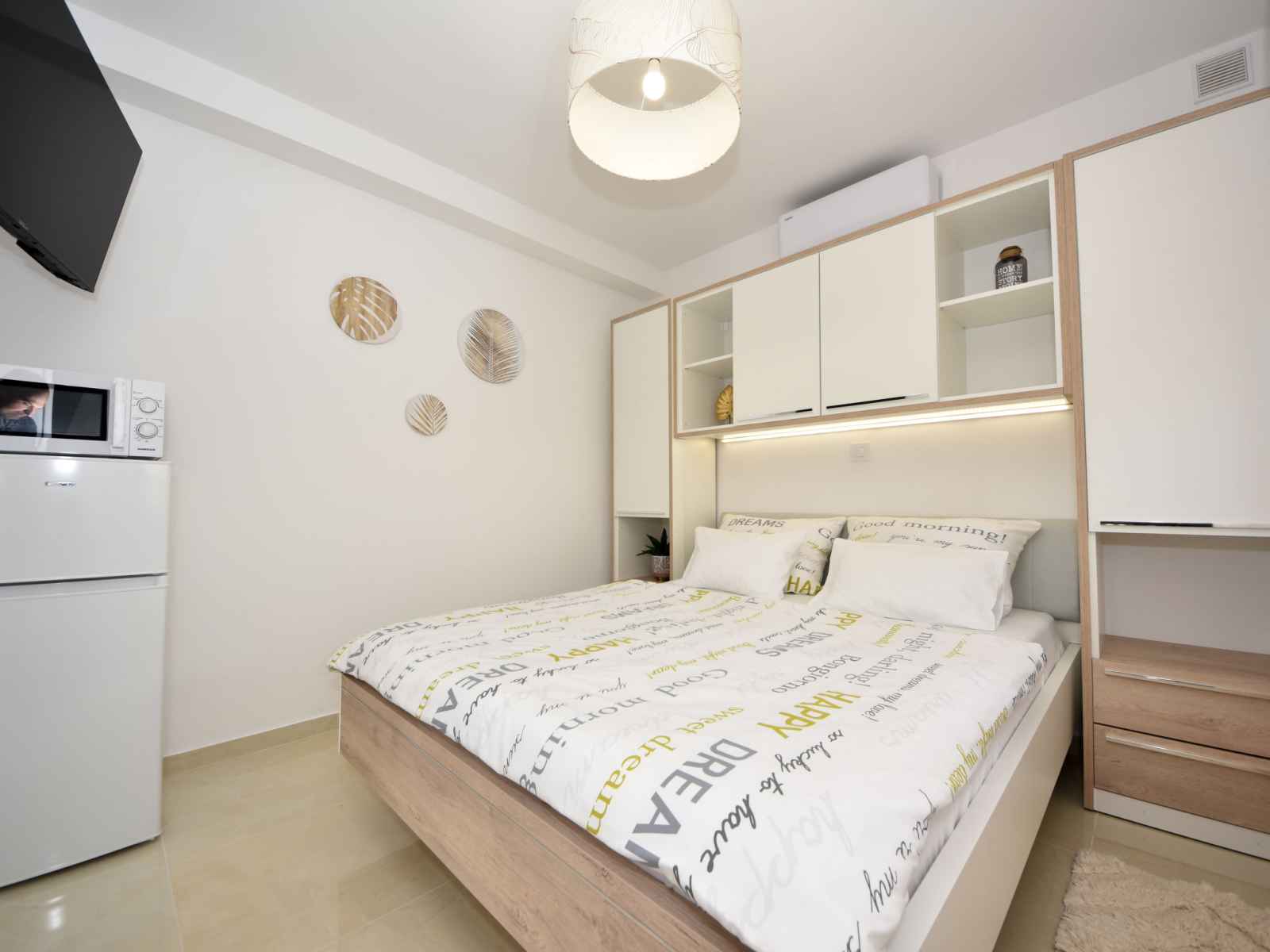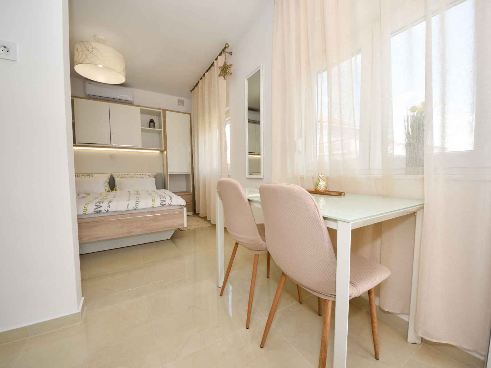 Studio 19 m2, au rez-de-chaussée, situation nord-est. studio avec 1 grand-lit (160 cm, longueur 200 cm), table pour les repas et tv (satellite) (écran plat), air-conditionné. sortie sur la terrasse. cuisine ouverte (lave-vaisselle, 2 plaques vitrocéramiques, micro-ondes, congélateur). douche/wc. pas de chauffage. terrasse 3 m2. meubles de