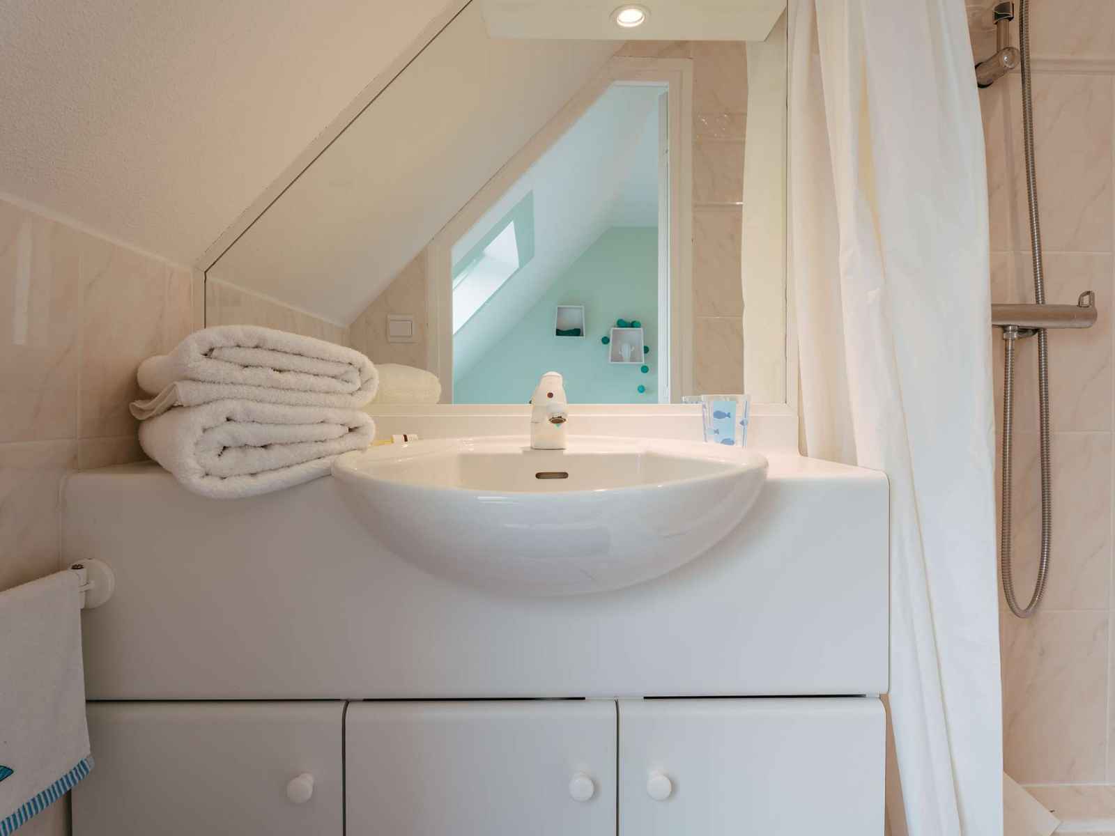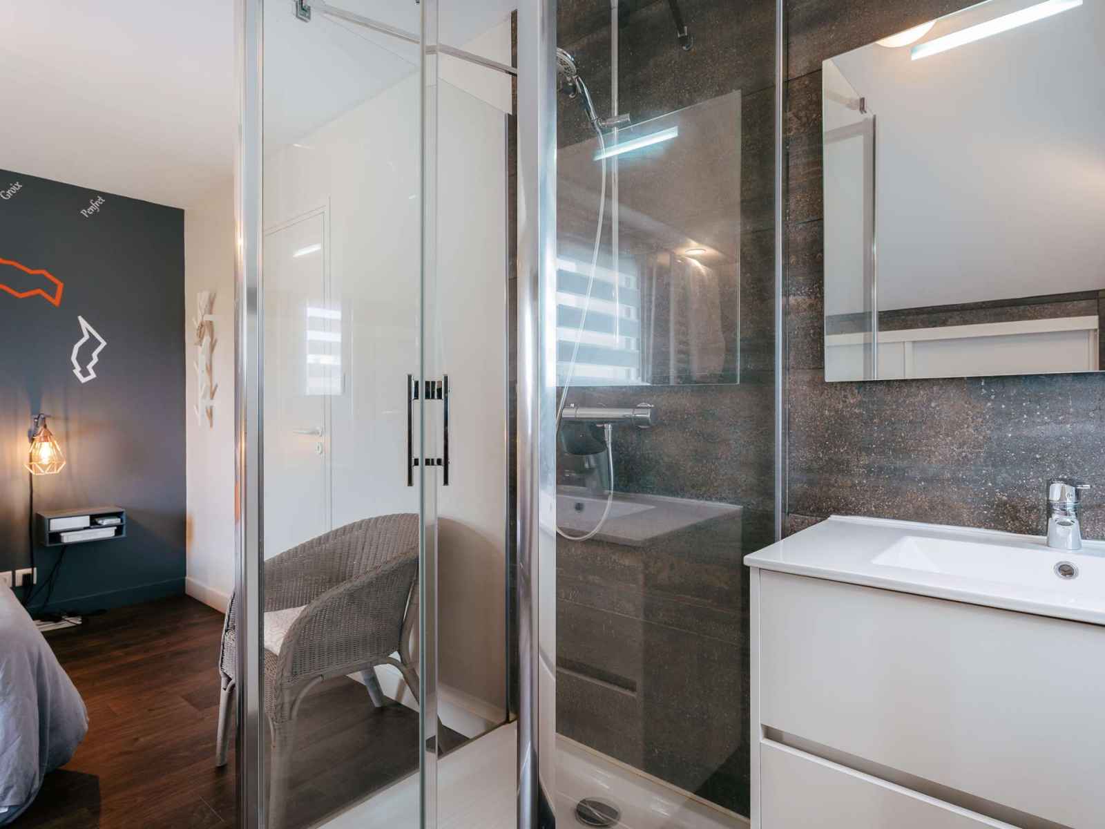 - 1 suite parentale avec 1 lit double (140, couette) et salle d'eau ouverte attenante (douche plate)