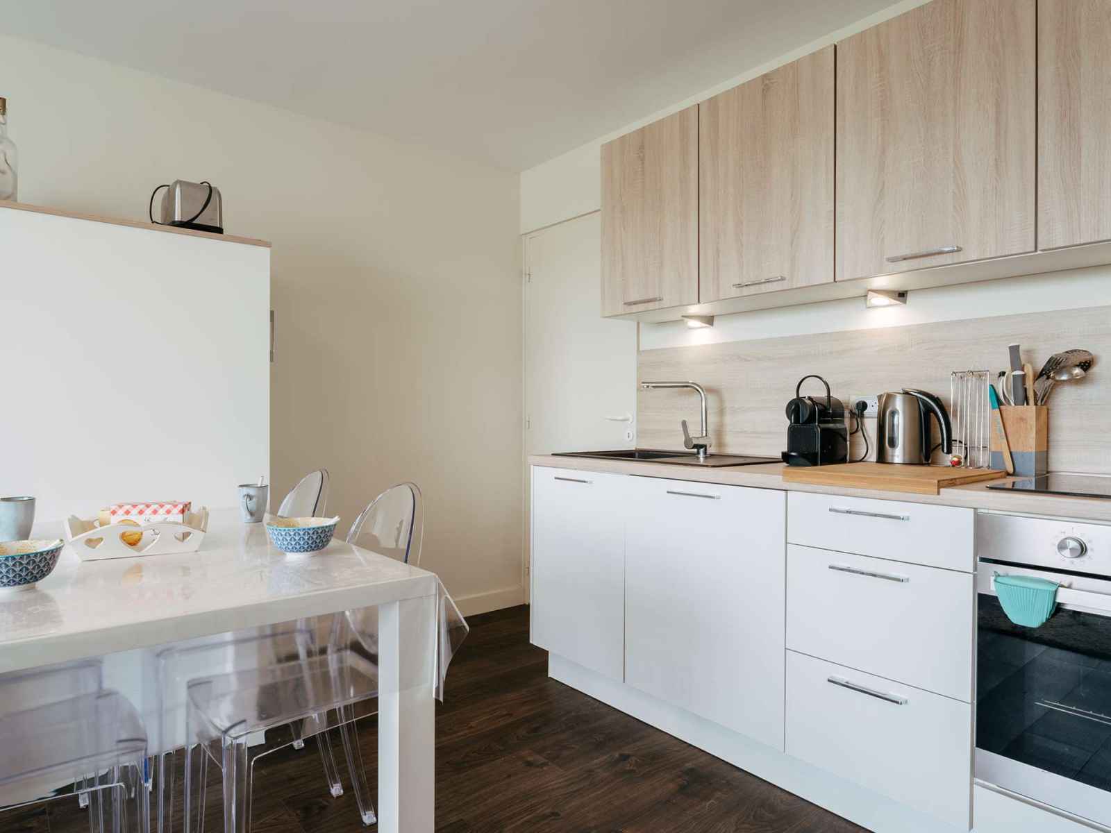 - Coin-cuisine équipé (plaque induction 2 feux, four, micro ondes, réfrigérateur avec partie freezer, lave-vaisselle, lave-linge, cafetière Nespresso)