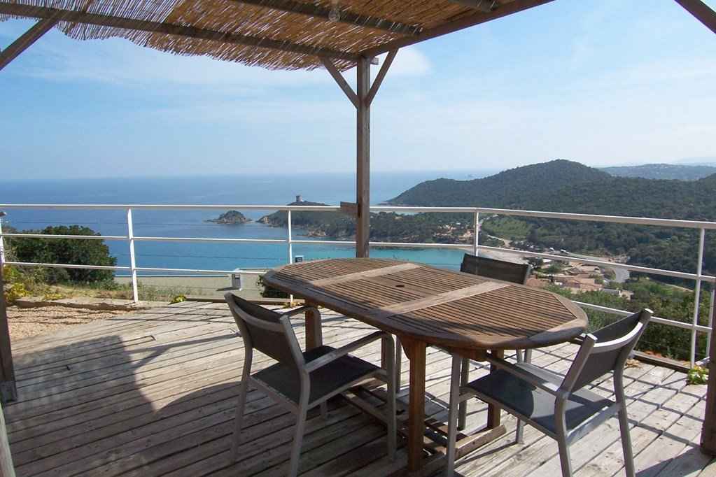 Terrasse 1 (stupéfiante vue panoramique sur la mer et ses plages) : salon de jardin (teck), parasol, barbecue charbon