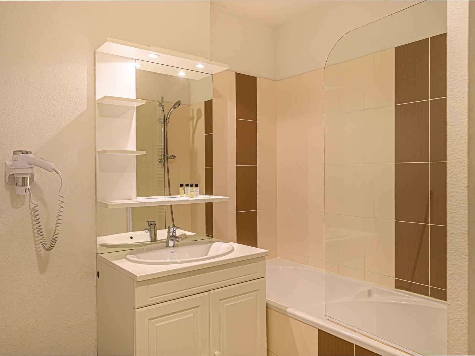 Salle de bains avec baignoire, sèche-cheveux + WC intégré (douche dans les appartements PMR)