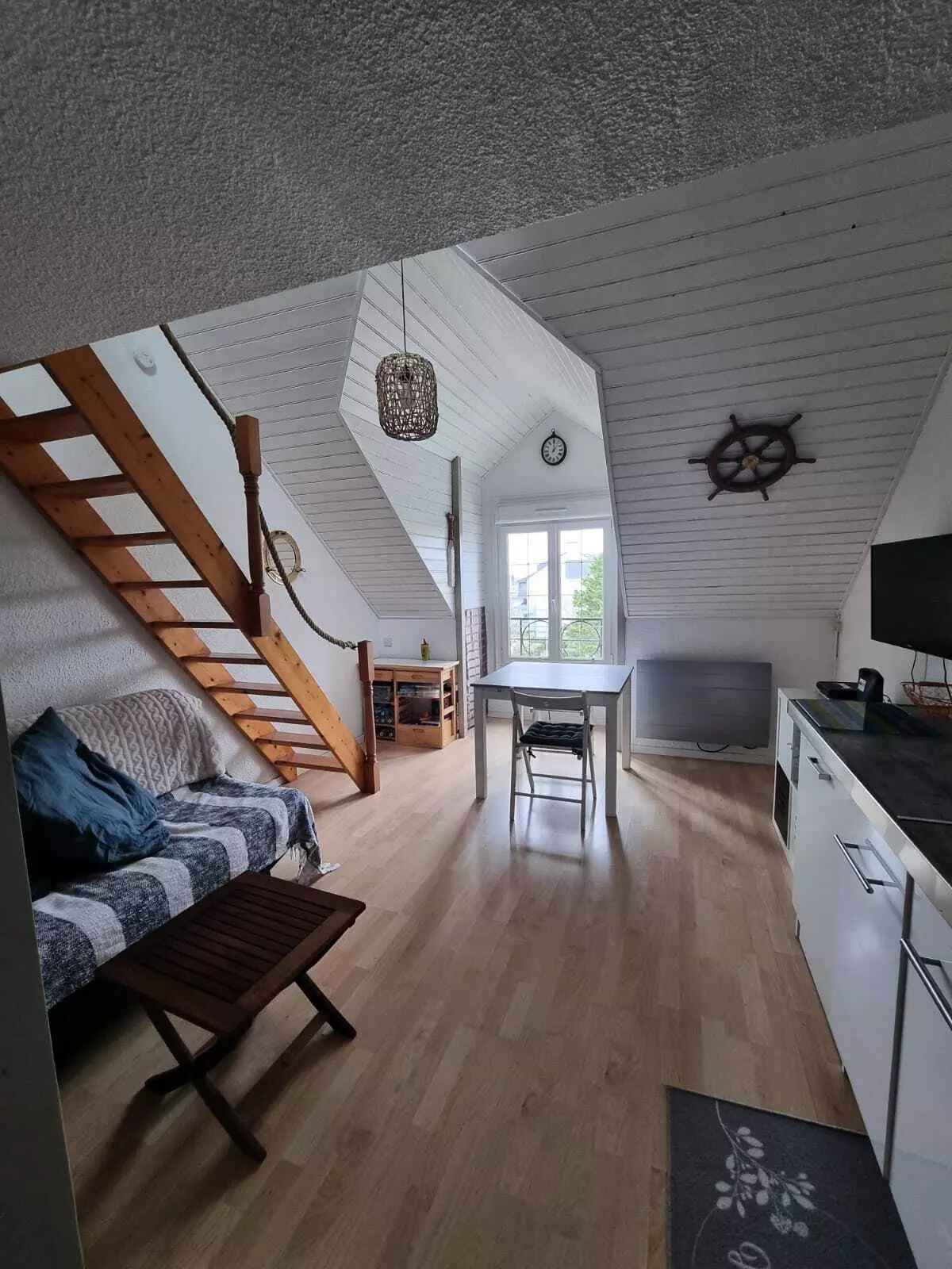 - un séjour avec un canapé-lit type bz pour 2 personnes et une banquette-lit pour une personne (couettes)