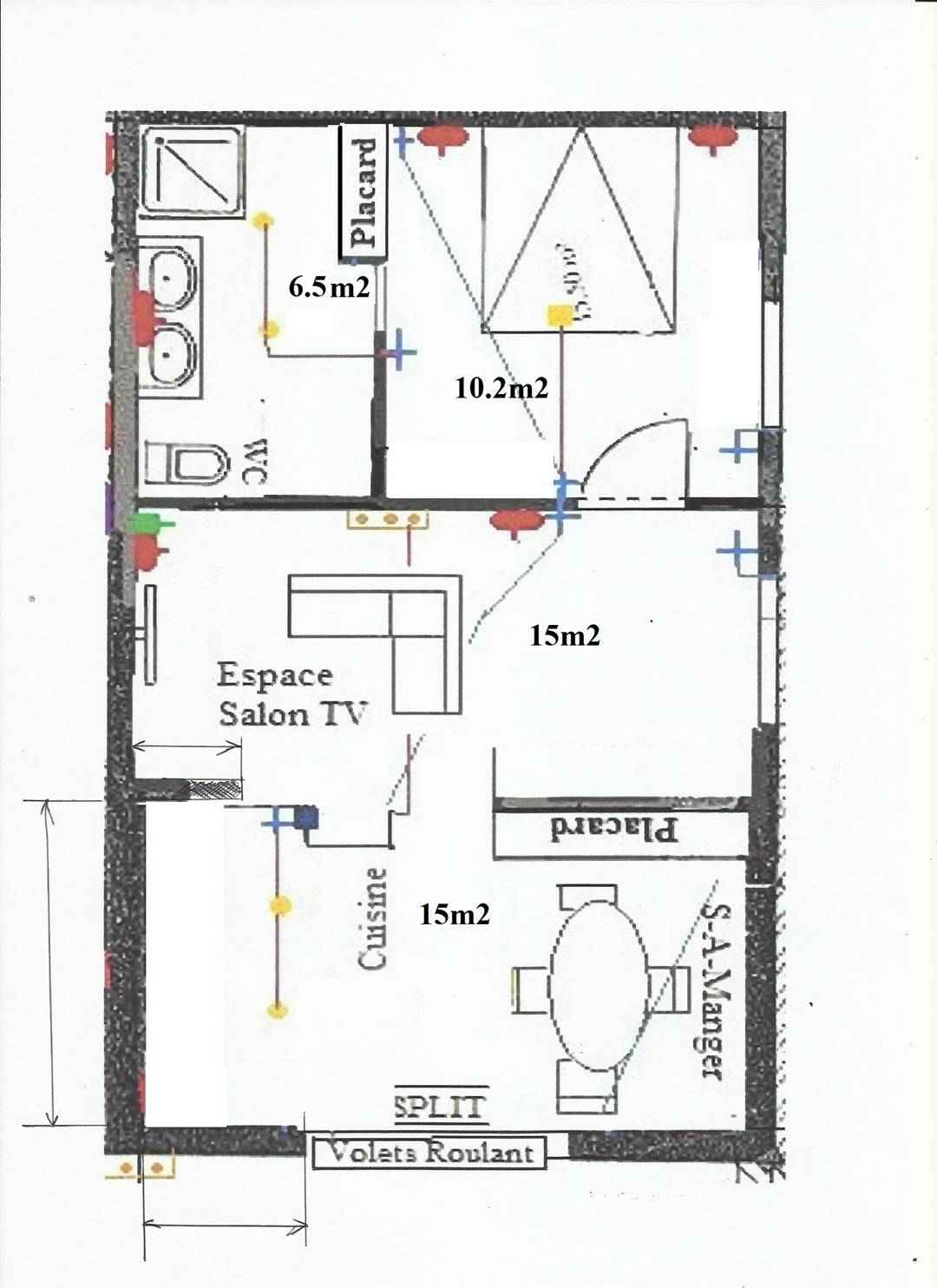 - Séjour/cuisine (Plaque vitro-céramique, four, micro-ondes, combiné congélateur réfrigérateur, grille pain, lave-vaisselle,télévision, canapé, tnt, bibliothèque, fer à repasser, balais..)