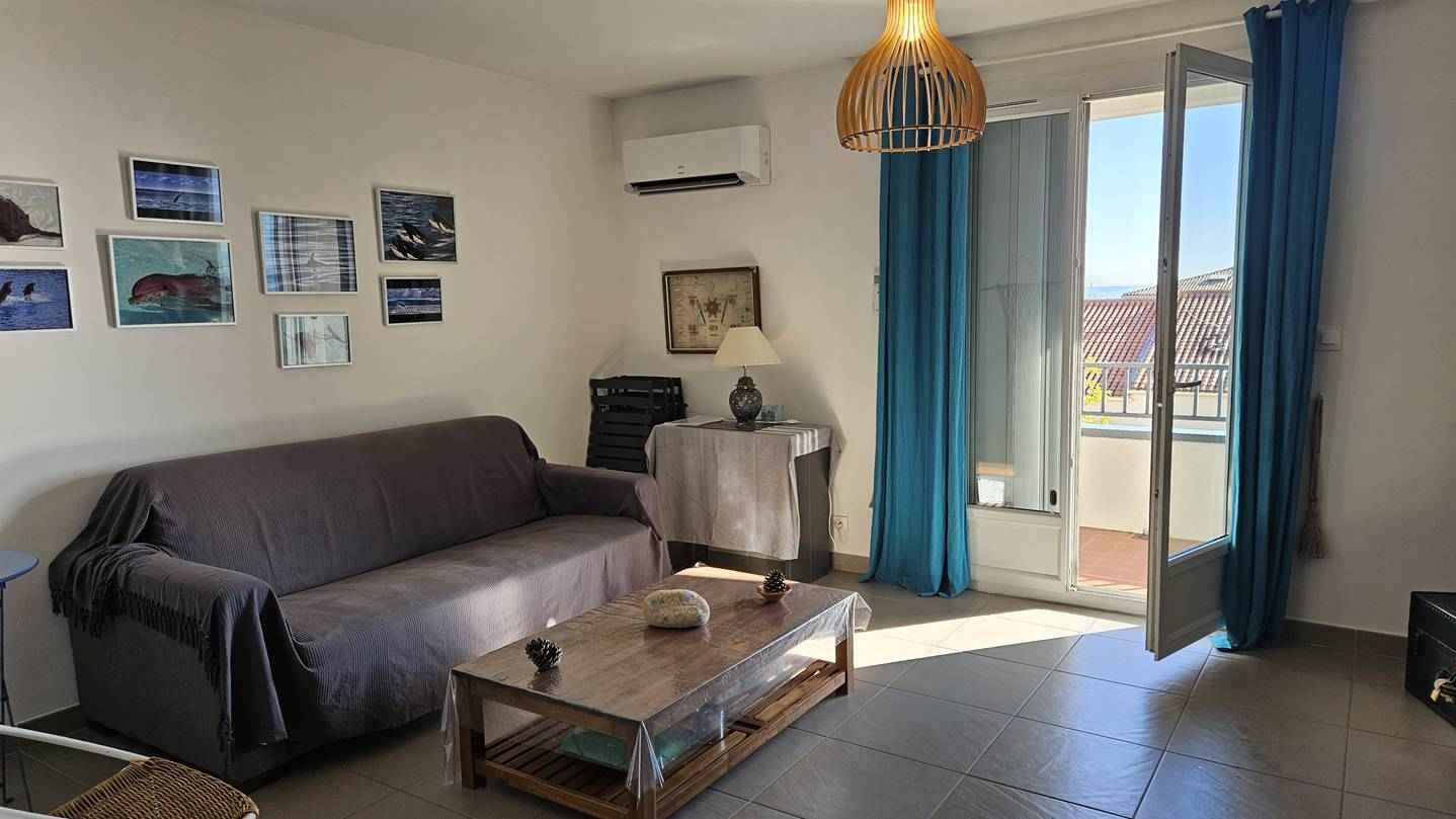 - Séjour :(clim) 2 canapés convertibles (en 140), TV (écran plat avec TNT), ouverture sur terrasse couverte : vue mer et village, table de jardin.