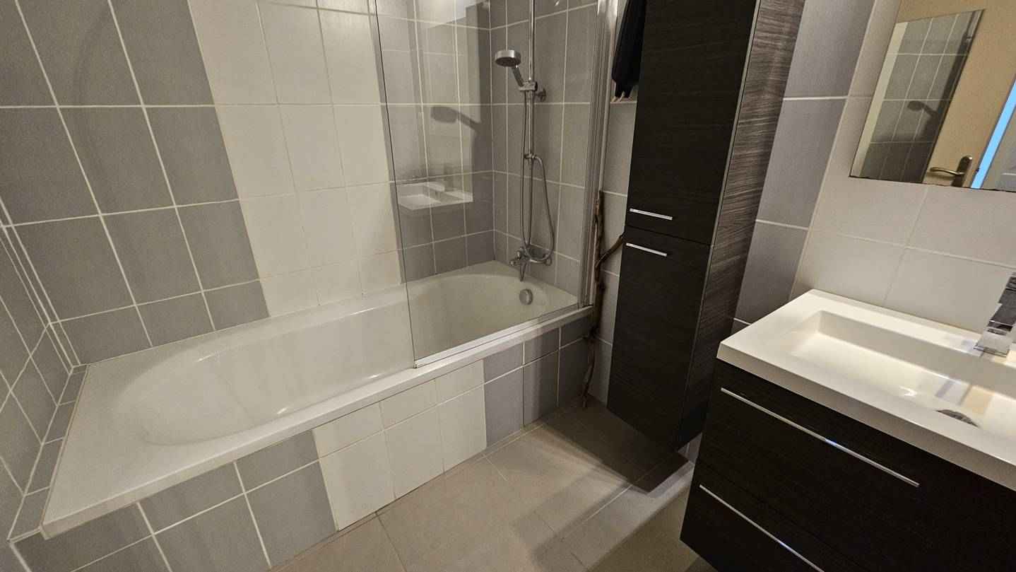 - Salle de bain : baignoire, vasque, sèche-serviette.