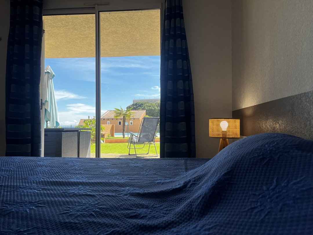 - Chambre 1 (Baie vitrée - accès terrasse - vue mer et piscine : lit (2 personnes 1 x 160)