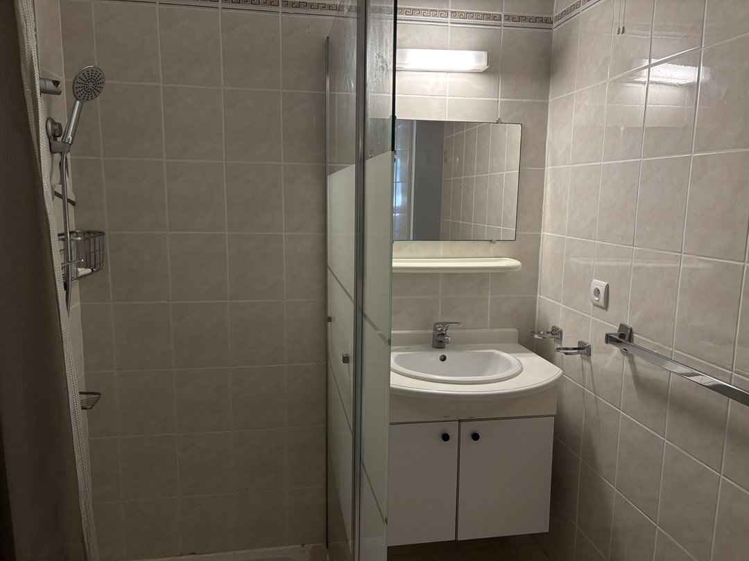 Salle d'eau : douche, lavabo, sèche-serviettes.