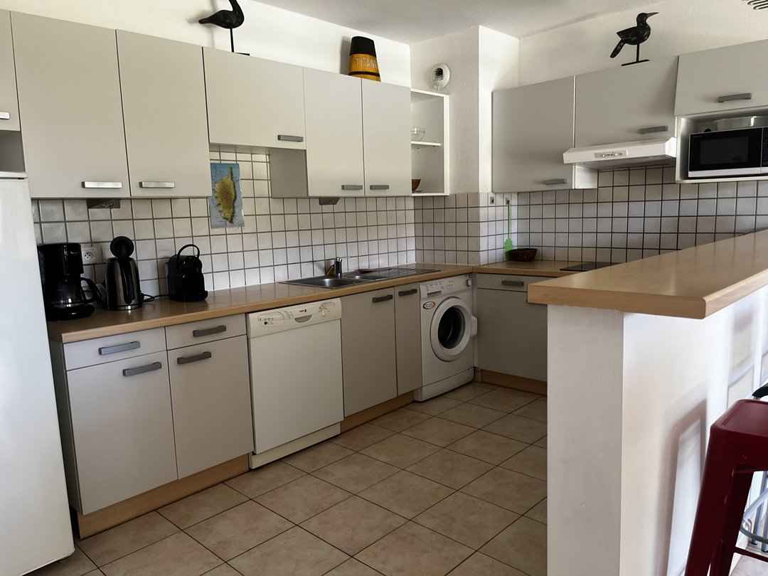 Cuisine américaine : four, hotte, frigidaire, lave-vaisselle, rangements, micro-ondes, cafetière classique + Nespresso, bar donnant sur séjour.