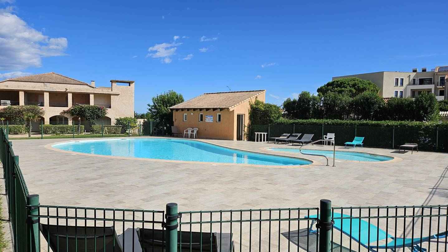 Piscine résidence : bassin adultes - bassin enfants - accès sécurisé) : douche, bains de soleil autour de la piscine