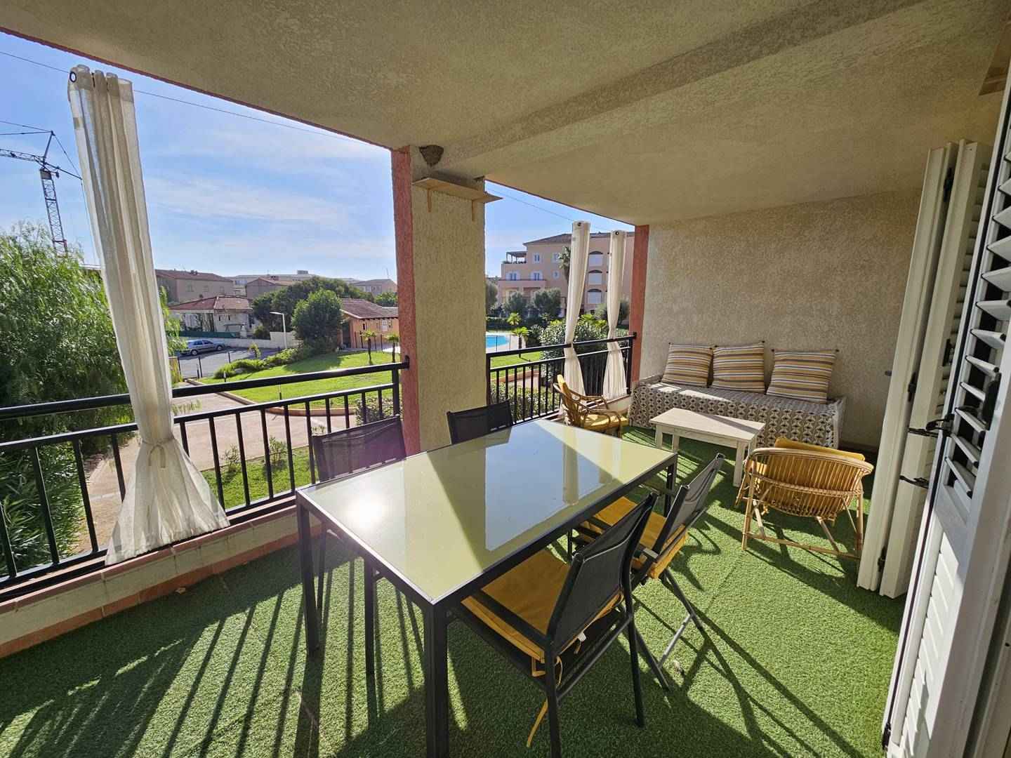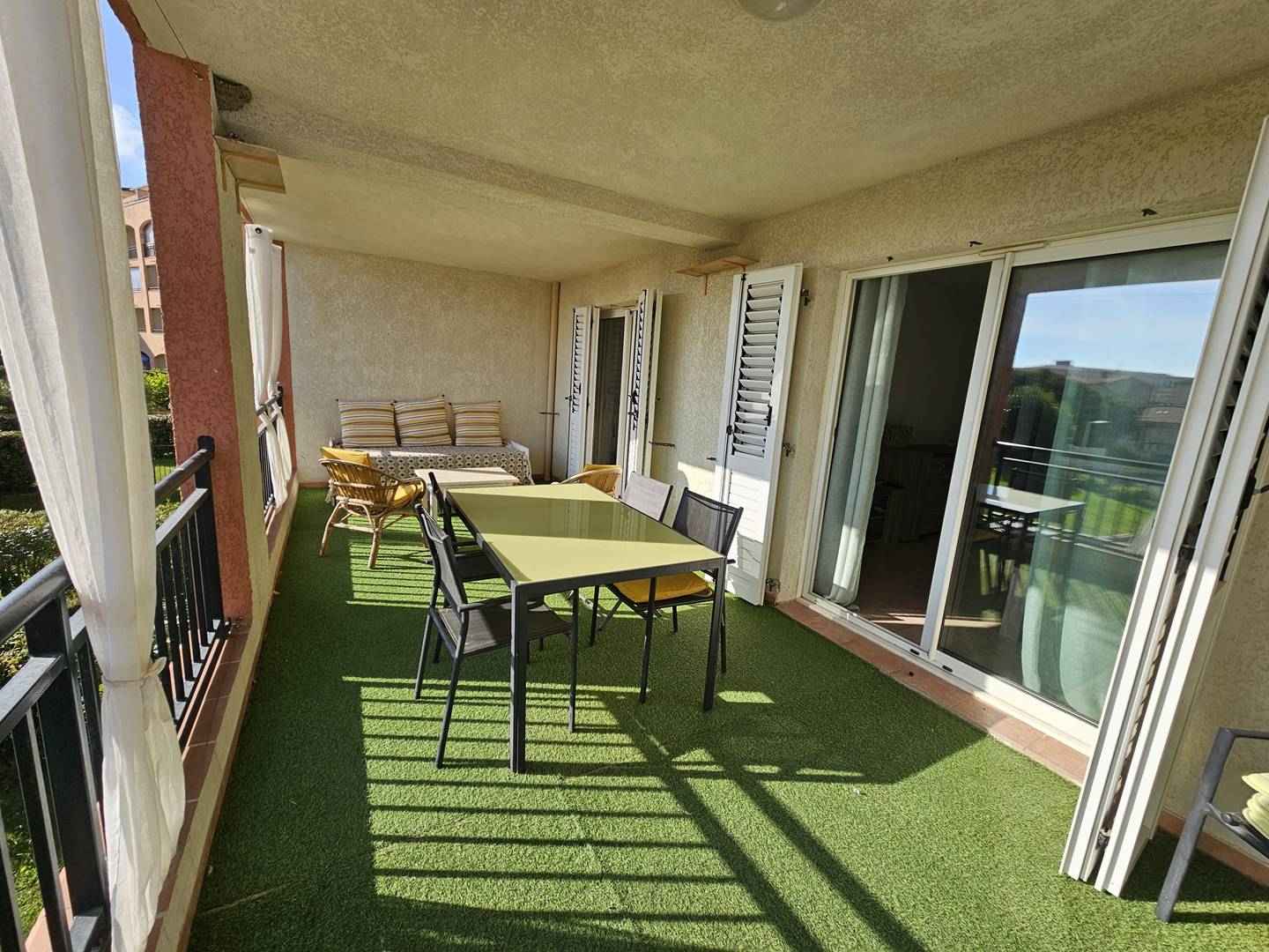 dans une résidence de standing, avec piscine, cet appartement confortable au 1er étage est idéalement situé à proximité du port de plaisance, des commerces et de la plage (150 m) de scaffa rossa.