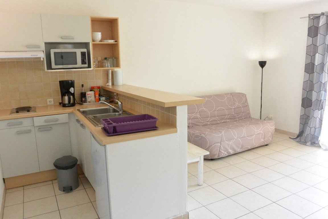kitchenette sur séjour, plaque induction, four micro-onde, cafetière, rangements.)
