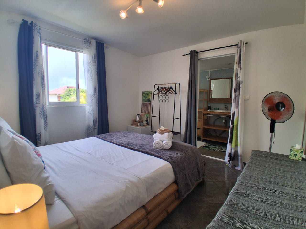 Chambre de deux personnes équipée d'un lit queen size (160x200), d’une commode, d’un portant à vêtement, d’une salle d’eau privative. sont à votre disposition: sèche-cheveux, serviette de bain, serviette de piscine, peignoirs, savon et shampoing, petit frigo, un plateau/bouilloire. la chambre n'est pas accessible en fauteuil roulant.