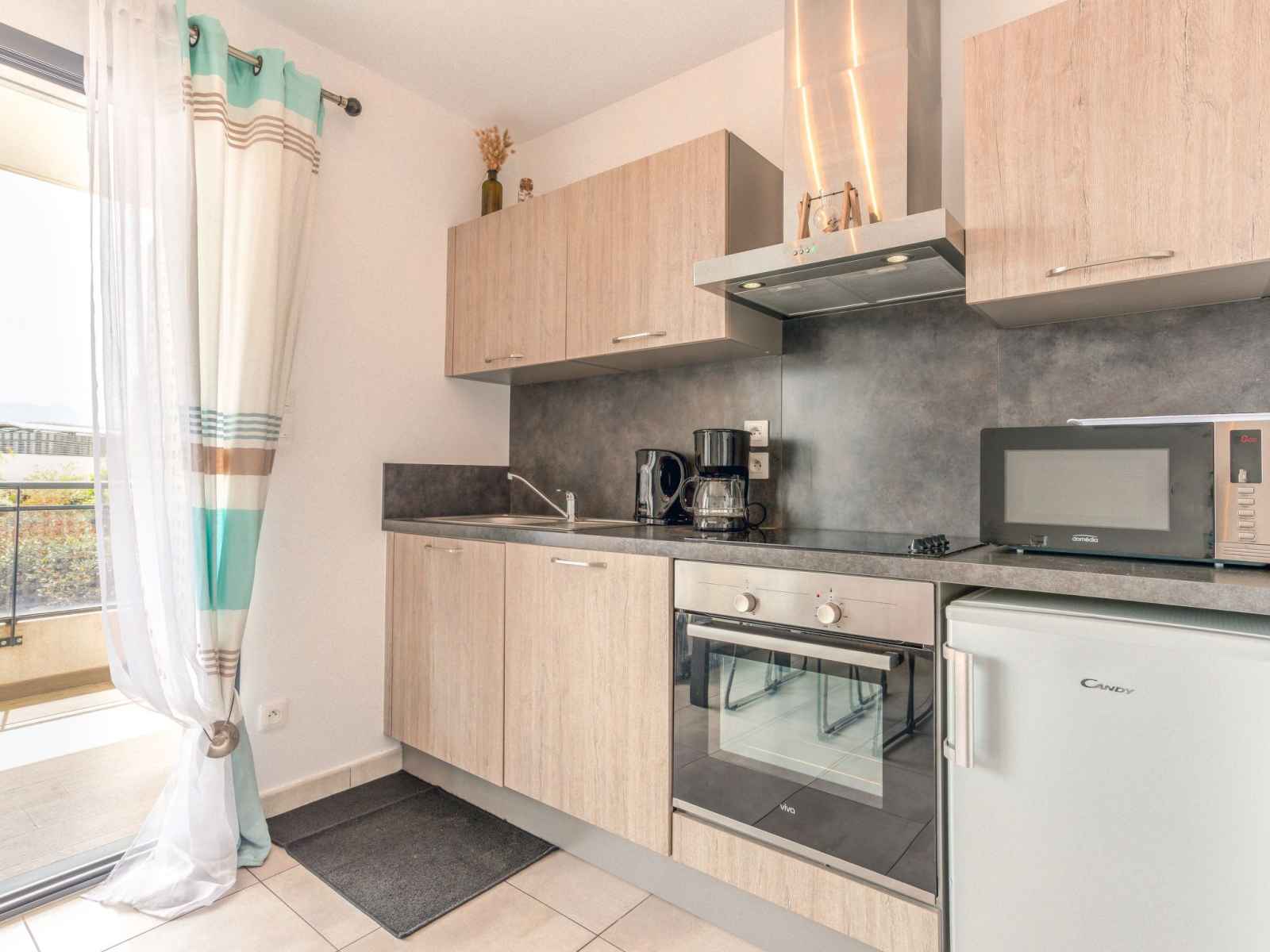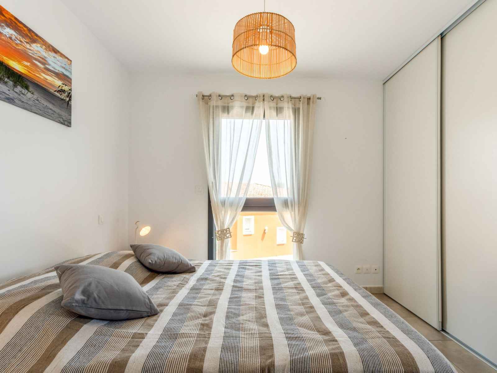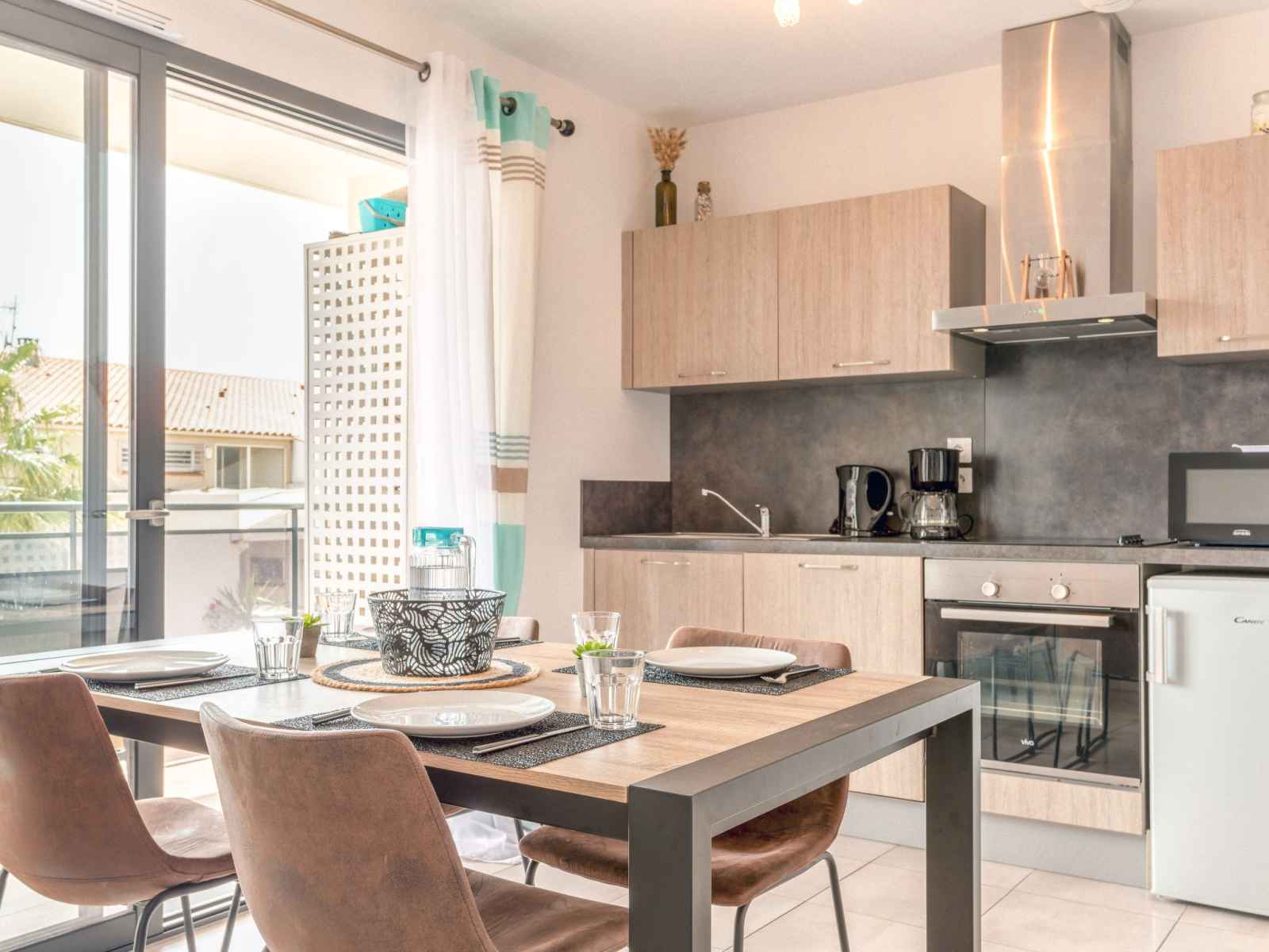 Apt 2 pièces 33 m2 au 1er étage. aménagement agréable: séjour/salle à manger avec 1 divan-lit double (140 cm, longueur 190 cm), tv (écran plat). sortie sur la terrasse. 1 chambre avec 1 grand-lit (160 cm, longueur 200 cm), lavabo et douche. cuisine ouverte (four, lave-vaisselle, 4 plaques vitrocéramiques, grille-pain, micro-ondes,